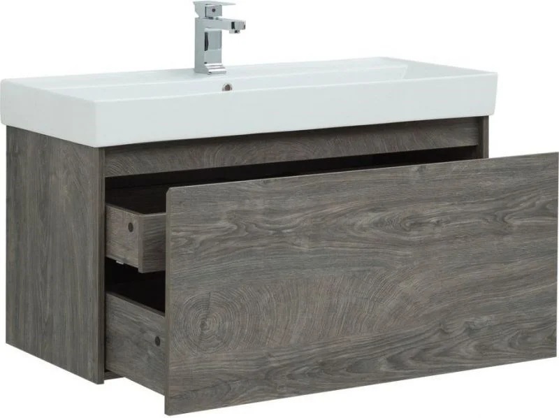 Тумба с раковиной Aquanet Nova Lite 100 из влагостойкой ламинированной древесно-стружечной плиты в благородном цвете «дуб рошелье» имеет достойный вид. Фактура натурального дерева выглядит изысканно, а подвесной монтаж придает визуальную легкость тумбе шириной 100 см. Тумба оборудована одним большим ящиком, внутри которого предусмотрен маленький с выемкой для установки сифона и разделителями, где удобно хранить необходимые в ванной комнате мелочи. Фасады выполнены с декоративной интегрированной ручкой, не имеющей острых краев и внутренних углов, что обеспечивает удобство в эксплуатации и легкий уход за мебелью. Ящики комплектуются направляющими немецкого производства Hettich Quadro, оснащенными доводчиками. Неглубокая и стильная керамическая раковина «Латина» идеально подходит к тумбе.