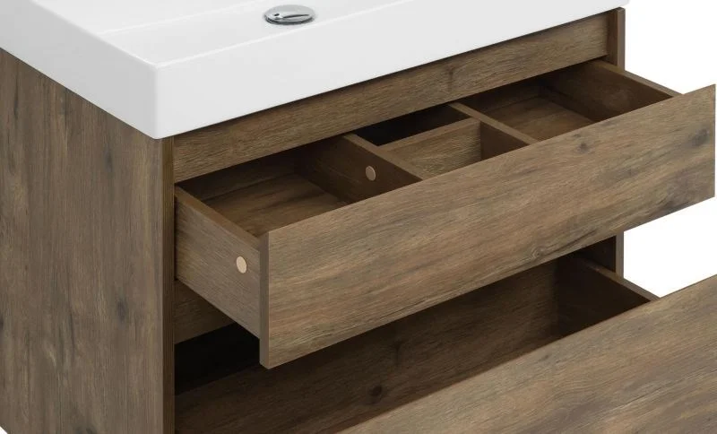 Тумба с раковиной Aquanet Nova Lite 75 из влагостойкой ламинированной древесно-стружечной плиты в изысканном цвете «дуб рустикальный» имеет достойный вид. Фактура натурального дерева выглядит благородно, а подвесной монтаж придает визуальную легкость тумбе шириной 75 см. Она оборудована двумя выдвижными ящиками. Ящики довольно вместительные и позволяют разместить все необходимое. Фасады выполнены с декоративной интегрированной ручкой, не имеющей острых краев и внутренних углов, что обеспечивает удобство в эксплуатации и легкий уход за мебелью. Ящики комплектуются направляющими немецкого производства Hettich Quadro, оснащенными доводчиками. Неглубокая и стильная керамическая раковина «Латина» идеально подходит к тумбе.