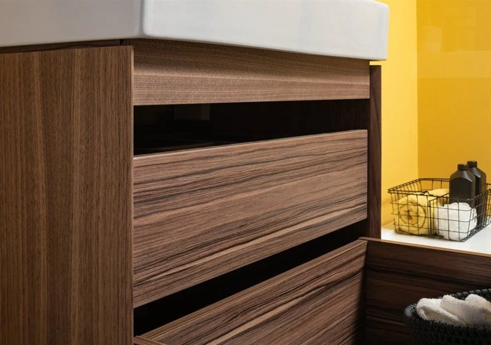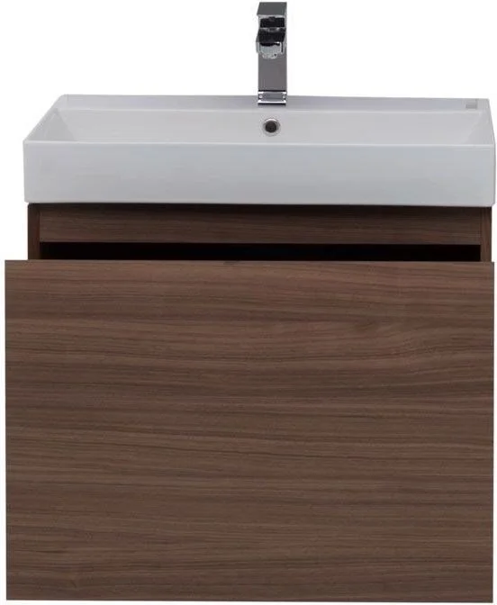 Тумба с раковиной Aquanet Нью-Йорк 70 (орех) не нуждается в дополнительных декоративных деталях, живописной фурнитуре – шпон ореха, используемый в качестве покрытия, выполняет функции декорирования наилучшим образом. А для открывания ящичков тумбы торцевые детали фасадов снабжены специальными скосами, что превращает их в удобный элемент открывания. Это так популярные сейчас интегрированные ручки. Система хранения в тумбе шириной 70 см с секретом. Внутри одного большого ящика спрятан еще один – для хранения мелочей, где для правильной организации хранения предусмотрено три отделения: два побольше и одно совсем маленькое. Плавность открывания-закрывания обеспечивает фурнитура немецкой компании Hettich. Белоснежная керамическая раковина Slim Synergy производства турецкой компании Sanovit служит не только неотъемлемой функциональной деталью тумбы, но и ее украшением, настолько изящны и плавны ее линии, необычна форма. Корпус традиционно для мебели Aquanet выполнен из влагостойкой ЛДСП, фасады – из МДФ. Тумба имее