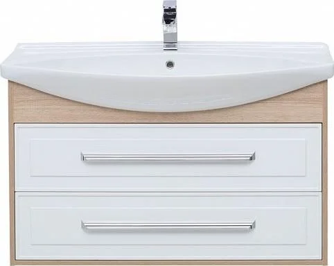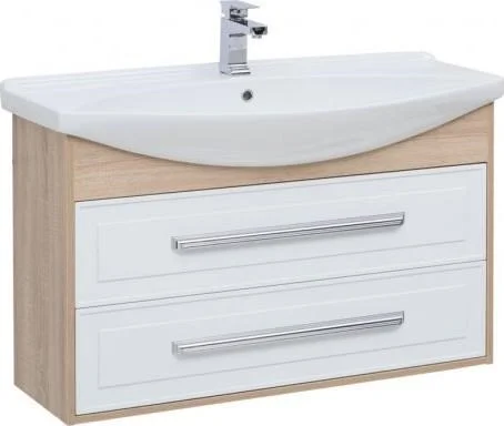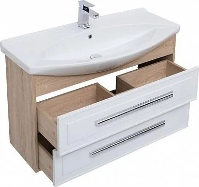 Тумба с раковиной Aquanet Остин 105 в цвете "дуб сонома/белый" чрезвычайно эффектно смотрится благодаря мягкому контрасту светлых деревянных деталей корпуса в цвете «дуб сонома» с белыми глянцевыми фасадами выдвижных ящиков со строгой фрезеровкой. Лаконичные хромированные ручки подчеркивают элегантность узора на фасаде. Особенно хороша на этом фоне белоснежная керамическая раковина чешского бренда Dreja, которая в этом комплекте является не только функциональной деталью, неотъемлемой частью тумбы, но и декоративным элементом. Тумба шириной 105 см станет настоящим украшением интерьера с акцентом на стили ретро, кантри, прованс.