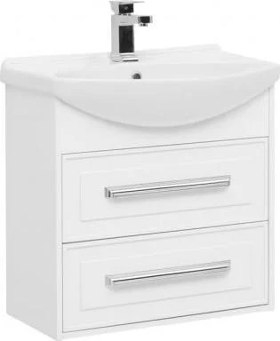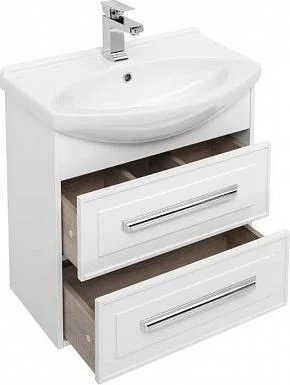 Тумба с раковиной Aquanet Остин 65 белого цвета чрезвычайно эффектно смотрится благодаря белым глянцевым фасадам выдвижных ящиков со строгой фрезеровкой. Лаконичные хромированные ручки подчеркивают элегантность узора на фасаде. Особенно хороша в компании с поблескивающим глянцем фасадов белоснежная керамическая раковина чешского бренда Dreja, которая в этом комплекте является не только функциональной деталью, неотъемлемой частью тумбы, но и декоративным элементом. Тумба шириной 65 см станет настоящим украшением интерьера ванной комнаты.