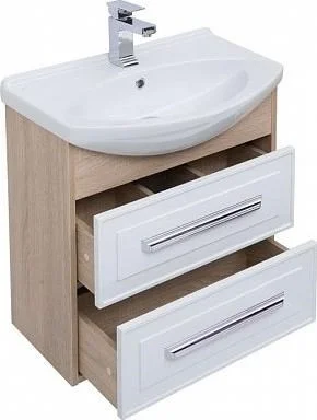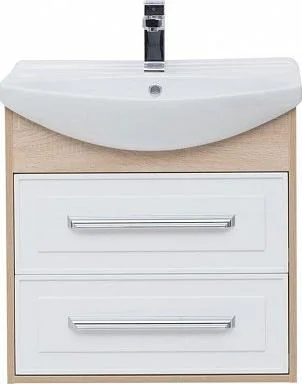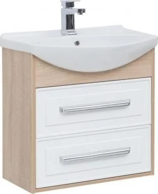 Тумба с раковиной Aquanet Остин 65 в цвете "дуб сонома/белый" чрезвычайно эффектно смотрится благодаря мягкому контрасту светлых деревянных деталей корпуса в цвете «дуб сонома» с белыми глянцевыми фасадами выдвижных ящиков со строгой фрезеровкой. Лаконичные хромированные ручки подчеркивают элегантность узора на фасаде. Особенно хороша на этом фоне белоснежная керамическая раковина чешского бренда Dreja, которая в этом комплекте является не только функциональной деталью, неотъемлемой частью тумбы, но и декоративным элементом. Тумба шириной 65 см станет настоящим украшением интерьера с акцентом на стили ретро, кантри, прованс.