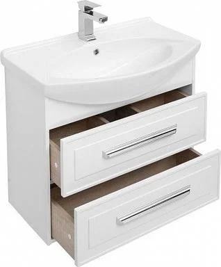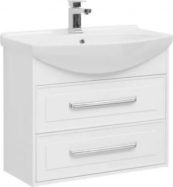 Тумба с раковиной Aquanet Остин 75 белого цвета чрезвычайно эффектно смотрится благодаря белым глянцевым фасадам выдвижных ящиков со строгой фрезеровкой. Лаконичные хромированные ручки подчеркивают элегантность узора на фасаде. Особенно хороша в компании с поблескивающим глянцем фасадов белоснежная керамическая раковина чешского бренда Dreja, которая в этом комплекте является не только функциональной деталью, неотъемлемой частью тумбы, но и декоративным элементом. Тумба шириной 75 см станет настоящим украшением интерьера ванной комнаты.