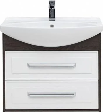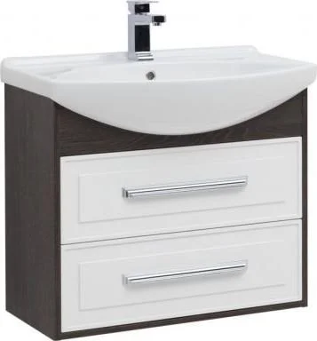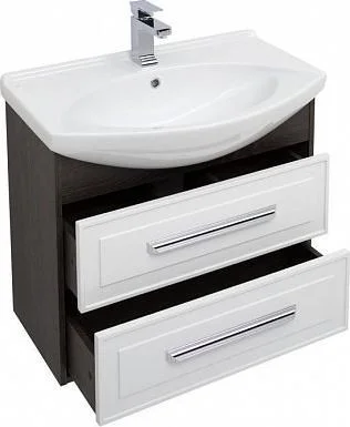 Тумба с раковиной Aquanet Остин 75 в цвете "дуб кантербери/белый" чрезвычайно эффектно смотрится благодаря яркому контрасту шоколадных деревянных деталей корпуса в цвете «дуб кантербери» с белыми глянцевыми фасадами выдвижных ящиков со строгой фрезеровкой. Лаконичные хромированные ручки подчеркивают элегантность узора на фасаде. Особенно хороша на этом фоне белоснежная керамическая раковина чешского бренда Dreja, которая в этом комплекте является не только функциональной деталью, неотъемлемой частью тумбы, но и декоративным элементом. Тумба шириной 75 см станет настоящим украшением интерьера, выполненного в любом стиле.