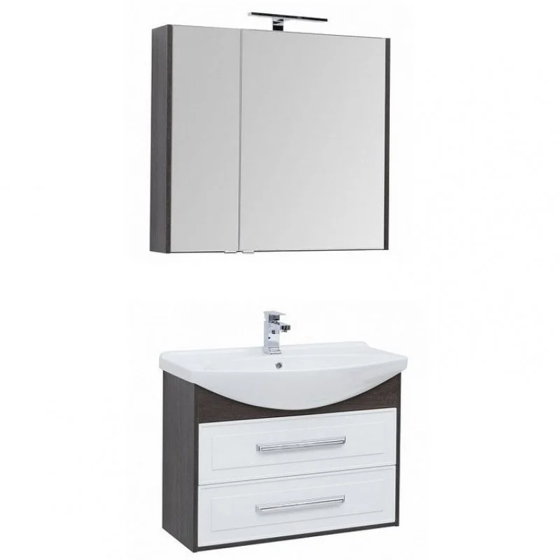 Тумба с раковиной Aquanet Остин 85 в цвете "дуб кантербери/белый" чрезвычайно эффектно смотрится благодаря яркому контрасту шоколадных деревянных деталей корпуса в цвете «дуб кантербери» с белыми глянцевыми фасадами выдвижных ящиков со строгой фрезеровкой. Лаконичные хромированные ручки подчеркивают элегантность узора на фасаде. Особенно хороша на этом фоне белоснежная керамическая раковина чешского бренда Dreja, которая в этом комплекте является не только функциональной деталью, неотъемлемой частью тумбы, но и декоративным элементом. Тумба шириной 85 см станет настоящим украшением интерьера, выполненного в любом стиле.