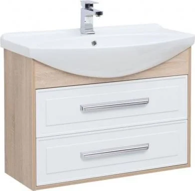 Тумба с раковиной Aquanet Остин 85 в цвете "дуб сонома/белый" чрезвычайно эффектно смотрится благодаря мягкому контрасту светлых деревянных деталей корпуса в цвете «дуб сонома» с белыми глянцевыми фасадами выдвижных ящиков со строгой фрезеровкой. Лаконичные хромированные ручки подчеркивают элегантность узора на фасаде. Особенно хороша на этом фоне белоснежная керамическая раковина чешского бренда Dreja, которая в этом комплекте является не только функциональной деталью, неотъемлемой частью тумбы, но и декоративным элементом. Тумба шириной 85 см станет настоящим украшением интерьера с акцентом на стили ретро, кантри, прованс.