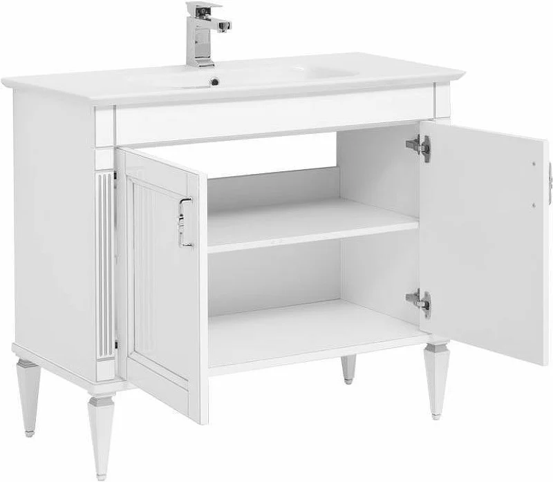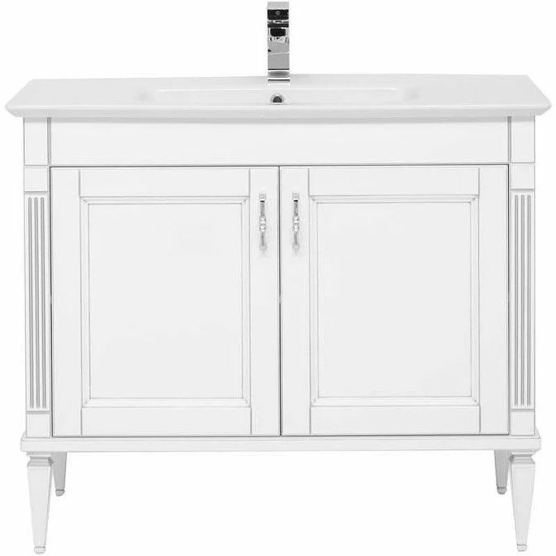 Тумба с раковиной Aquanet Селена 105 белый/серебро (2 дверцы) с эффектным патинированием серебром, с живописными украшениями в виде искусной фрезеровки по фасадам и корпусу, с замысловатыми ручками, украшенными кристаллами Swarovski, впечатляет с первого взгляда. Это яркий образец классической мебели. Тумба шириной 105 см выполнена с двумя распашными дверцами, за которыми скрывается просторная зона хранения. Для модели подобрана новинка из ассортимента турецкого производителя Sanovit - керамическая накладная раковина из коллекции Sharp. Ее отличает тонкий изящный край, широкие борта, которые вполне могут стать подобием полочки для размещения средств ежедневной гигиены. Тумба предназначена для напольной установки. Причем, ножки, на которые она устанавливается, также являются декоративным элементом, так как изящно выточены и имеют фрезеровку. Фасады всех изделий коллекции выполнены из МДФ и покрыты эмалью, а корпус – из влагостойкой ДСП. Петли немецкого производства фирмы Hettich.