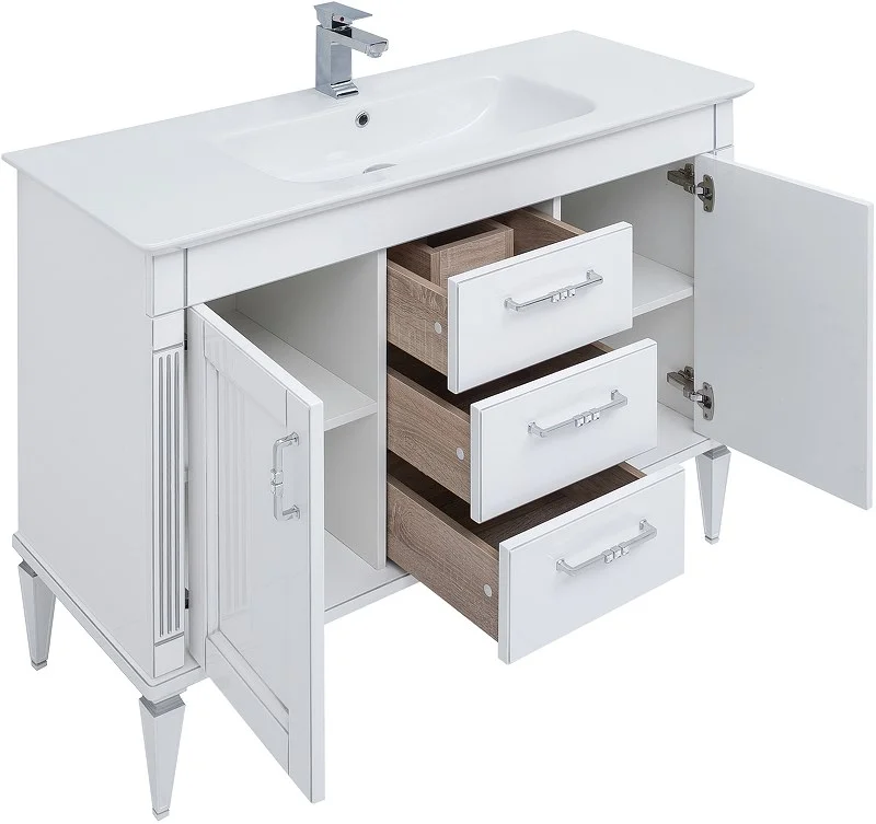 Тумба с раковиной Aquanet Селена 120 белый/серебро с эффектным патинированием серебром, с живописными украшениями в виде искусной фрезеровки по фасадам и корпусу, с замысловатыми ручками, украшенными кристаллами Swarovski, впечатляет с первого взгляда. Это яркий образец классической мебели. Тумба шириной 105 см выполнена с двумя распашными дверцами, за каждой из которых скрывается по две полочки, и три выдвижных ящика между ними. Для модели подобрана новинка из ассортимента турецкого производителя Sanovit - керамическая накладная раковина из коллекции Sharp. Ее отличает тонкий изящный край, широкие борта, которые вполне могут стать подобием полочки для размещения средств ежедневной гигиены. Тумба предназначена для напольной установки. Причем, ножки, на которые она устанавливается, также являются декоративным элементом, так как изящно выточены и имеют фрезеровку. Фасады изделия выполнены из МДФ и покрыты эмалью, а корпус – из влагостойкой ДСП. Петли и направляющие в шкафчиках немецкого производства фирмы Hetti