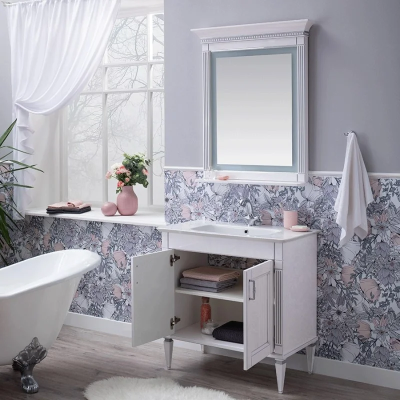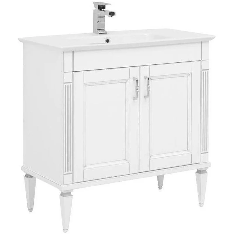 Тумба с раковиной Aquanet Селена 90 белый/серебро с эффектным патинированием серебром, с живописными украшениями в виде искусной фрезеровки по фасадам и корпусу, с замысловатыми ручками, украшенными кристаллами Swarovski, впечатляет с первого взгляда. Это яркий образец классической мебели. Тумба шириной 90 см выполнена с двумя распашными дверцами, за которыми скрывается просторная зона хранения. Для модели подобрана новинка из ассортимента турецкого производителя Sanovit - керамическая накладная раковина из коллекции Sharp. Ее отличает тонкий изящный край, широкие борта, которые вполне могут стать подобием полочки для размещения средств ежедневной гигиены. Фасады тумбы выполнены из МДФ и покрыты эмалью, а корпус – из влагостойкой ДСП. Петли немецкого производства фирмы Hettich.