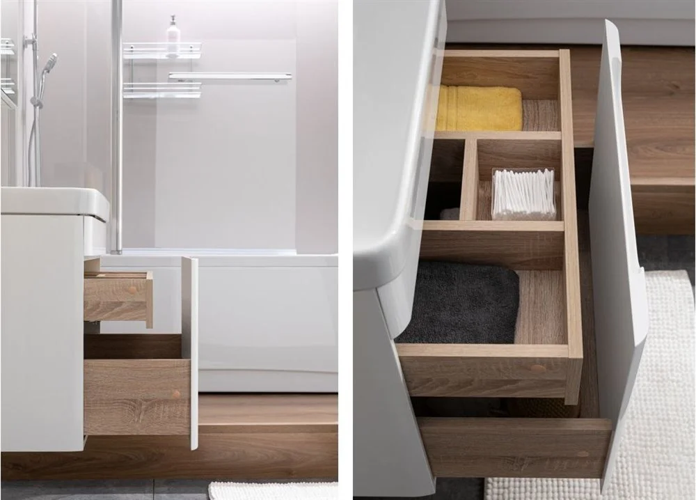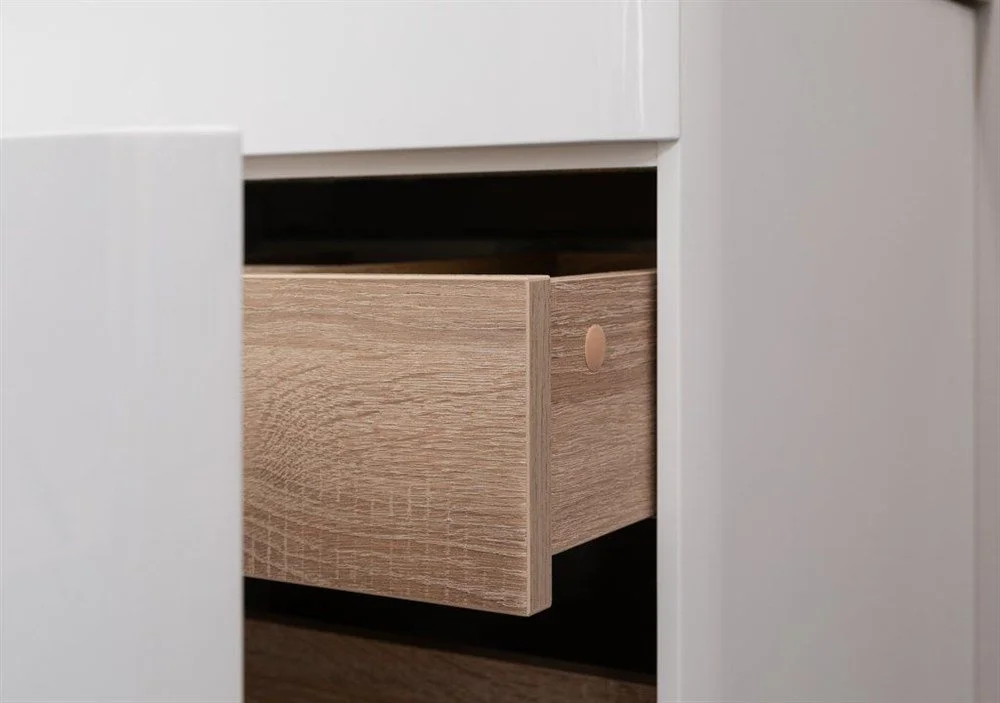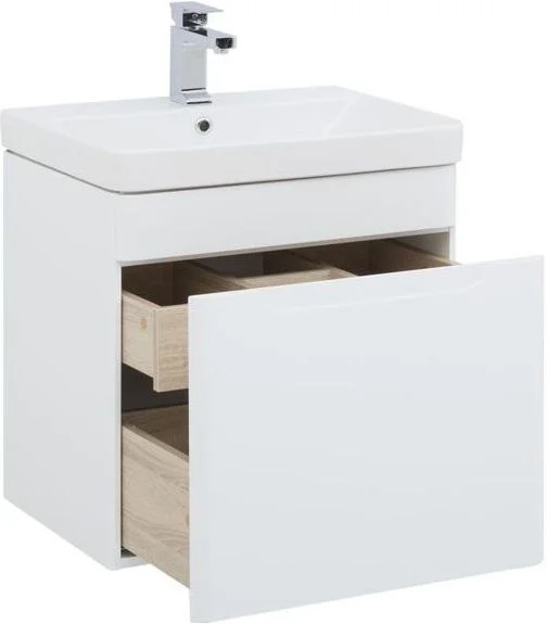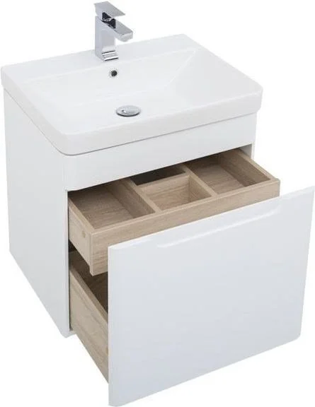 Тумба с раковиной Aquanet София 60 белого цвета относится к числу изделий, где все детали продуманы до мелочей. Простая форма прямоугольника - в основе подвесной тумбы, элегантно закругленные углы - для эстетичности и в целях безопасности, керамическая раковина, составляющая внешне единое целое с тумбой, многокомпонентная зона хранения, которая, несомненно, порадует рачительных хозяев. Для исполнения корпуса изделия использован влагостойкий ЛДСП, выкрашенный белой краской, фасады - из МДФ, внутренние ящики - ВЛДСП в цвете дуб сонома. Глянцевые поверхности выглядят безупречно. Конструкция внутреннего устройства тумбы шириной 60 см представляет собой большой выдвижной ящик, внутри которого предусмотрен еще один, небольшой, с тремя отделениями для размещения различных мелочей. Интегрированная ручка удобна в использовании, при этом выглядит элегантно и лаконично. <