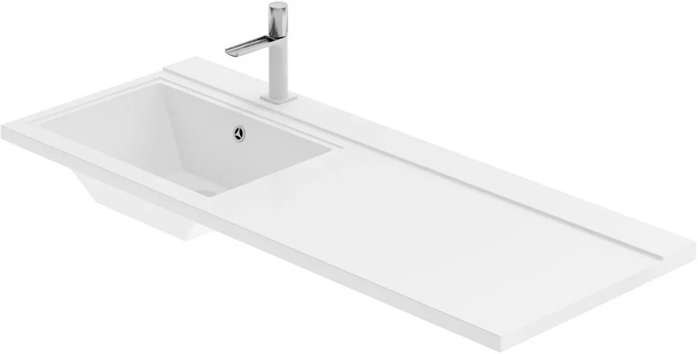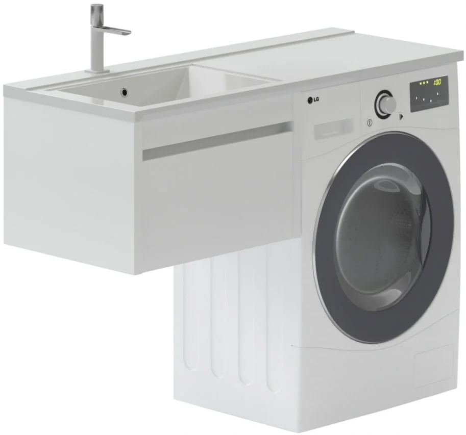 Тумба с раковиной Aquanet Токио 120 L (подвесная, 1 ящик) белого цвета представляет новый формат тумб производства Aquanet. Раковина из литьевого мрамора имеет длинную платформу, которая выходит далеко за пределы тумбы. Она предназначена для того, чтобы установить с правой стороны от тумбы стиральную машину. Платформа имеет такую длину, которая позволит спрятать под нее машинку средних размеров с фронтальной загрузкой. Корпус тумбы выполнен из влагостойкого ЛДСП, а фасад – из МДФ с покрытием эмалью. В подвесной тумбе шириной 580 мм место хранения предусмотрено в выдвижном ящике, оборудованном доводчиками, чтобы ход ящика при открывании/закрывании был плавным и без неприятных звуков. Тумбу можно использовать и без соседства со стиральной машиной, а свободное пространство под платформой раковины занять подкатной тумбой, полочками для полотенец или столиком.