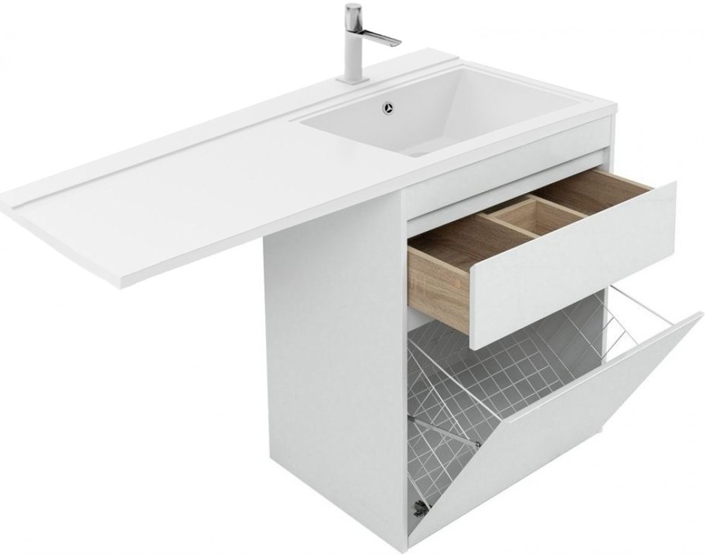 Напольная тумба с раковиной Aquanet Токио 120 R белого цвета представляет новый формат тумб производства Aquanet. Раковина из литьевого мрамора имеет длинную платформу, которая выходит далеко за пределы тумбы. Она предназначена для того, чтобы установить с левой стороны от тумбы стиральную машину. Платформа имеет такую длину, которая позволит спрятать под нее машинку средних размеров с фронтальной загрузкой. Корпус тумбы выполнен из влагостойкого ЛДСП, а фасады – из МДФ с покрытием эмалью. Две зоны хранения в тумбе шириной 580 мм - это выдвижной ящик с доводчиками для хранения важных мелочей и откидная дверка с закрепленной на ней бельевой корзиной. Тумбу можно использовать и без соседства со стиральной машиной, а свободное пространство под платформой раковины занять подкатной тумбой, приспособлениями для уборки помещения или столиком.