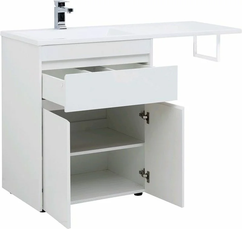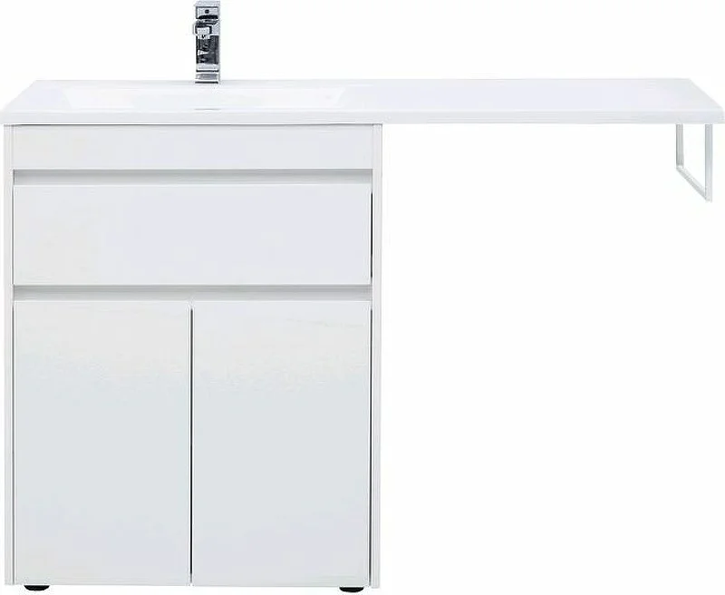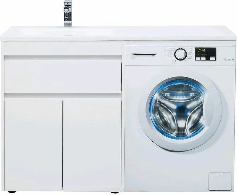Тумба с раковиной Aquanet Токио 130 L (напольная, 1 ящик, 2 дверцы) белого цвета представляет новый формат тумб производства Aquanet. Раковина из литьевого мрамора имеет длинную платформу, которая выходит далеко за пределы тумбы. Она предназначена для того, чтобы установить с правой стороны от тумбы стиральную машину. Платформа имеет такую длину, которая позволит спрятать под нее машинку средних размеров с фронтальной загрузкой. Корпус тумбы выполнен из влагостойкого ЛДСП, а фасады – из МДФ с покрытием эмалью. Разнообразные зоны хранения в тумбе шириной 680 мм скрыты в ящике и за распашными дверками. Тумбу можно использовать и без соседства со стиральной машиной, а свободное пространство под платформой раковины занять подкатной тумбой, приспособлениями для уборки помещения или столиком.