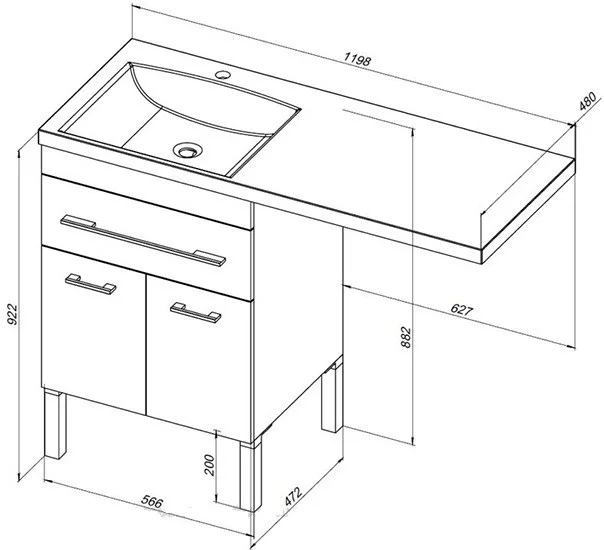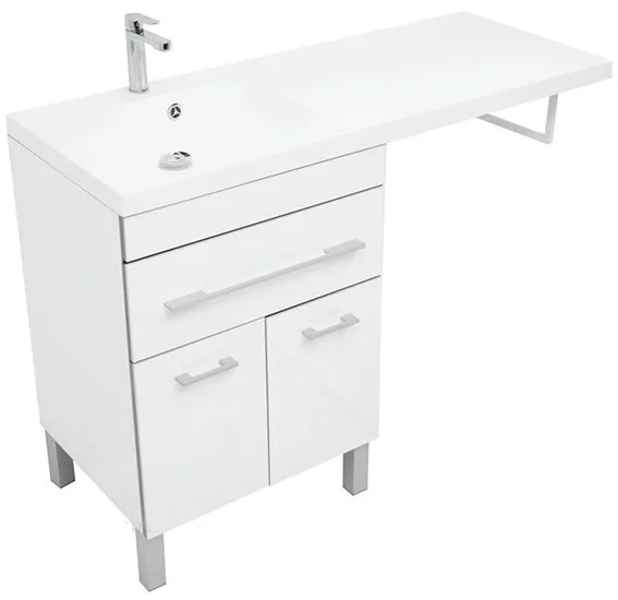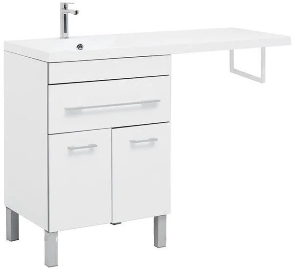С использованием раковины "Нота" (Aquanet) из литьевого мрамора с длинной площадкой, предназначенной для установки под ней стиральной машины, тумба приобретает новую функциональную нагрузку и практичное значение. В данной модели место для стиральной машины предусмотрено справа.