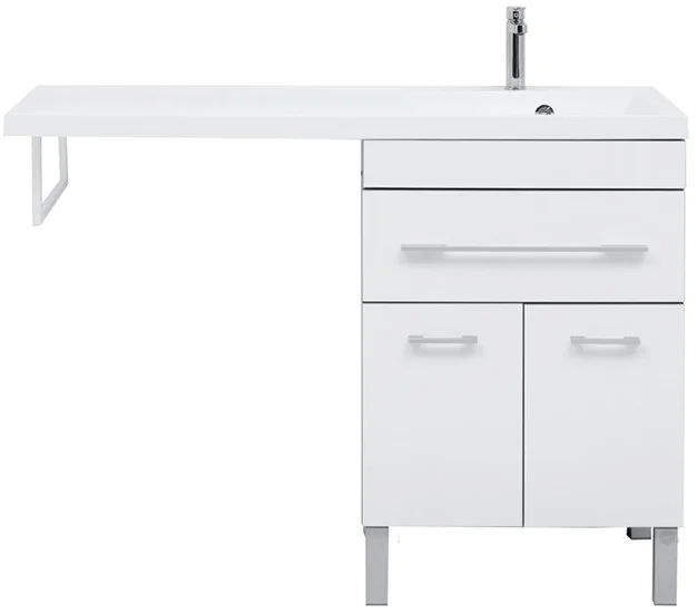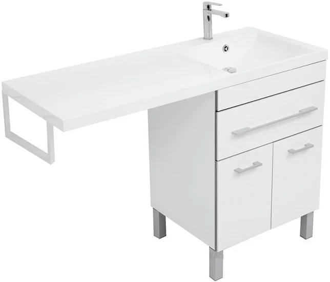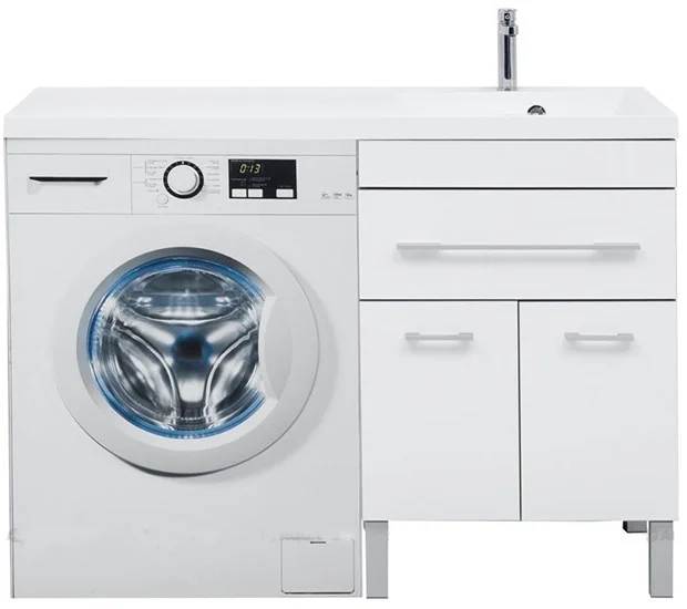 С использованием раковины "Нота" (Aquanet) из литьевого мрамора с длинной площадкой, предназначенной для установки под ней стиральной машины, тумба приобретает новую функциональную нагрузку и практичное значение. В данной модели место для стиральной машины предусмотрено слева.