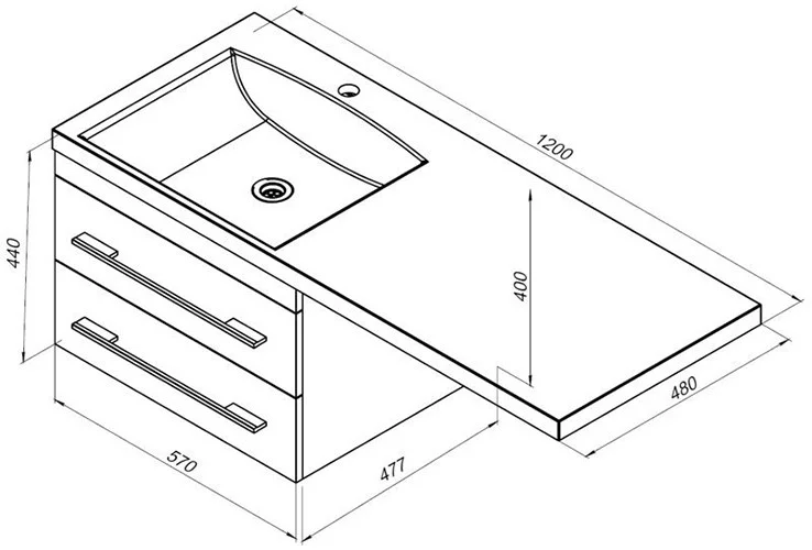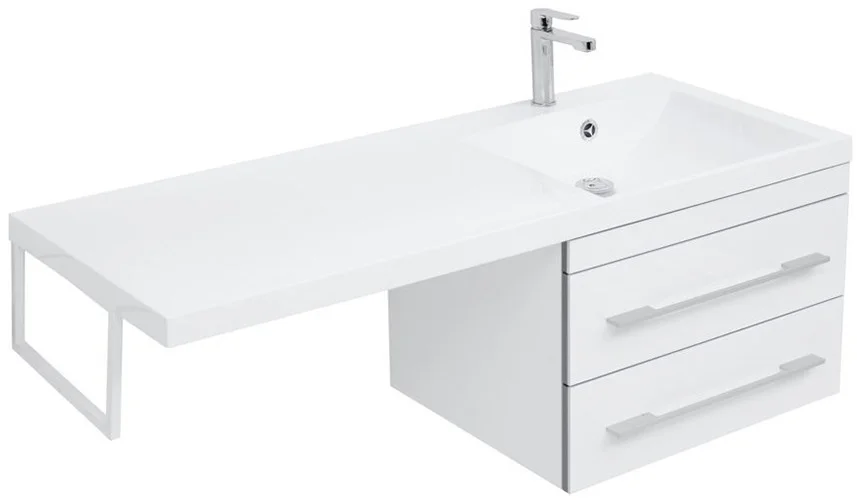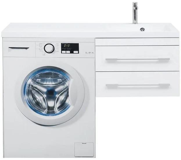 С использованием раковины "Нота" (Aquanet) из литьевого мрамора с длинной площадкой, предназначенной для установки под ней стиральной машины, тумба приобретает новую функциональную нагрузку и практичное значение. В данной модели место для стиральной машины предусмотрено слева.
