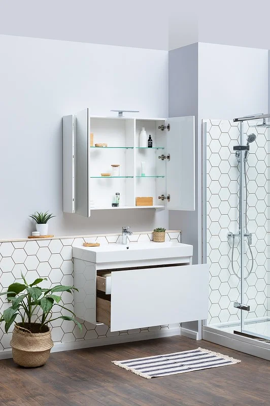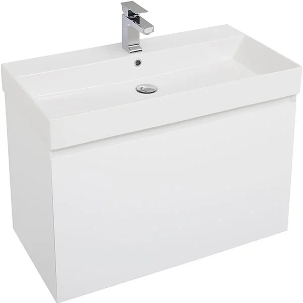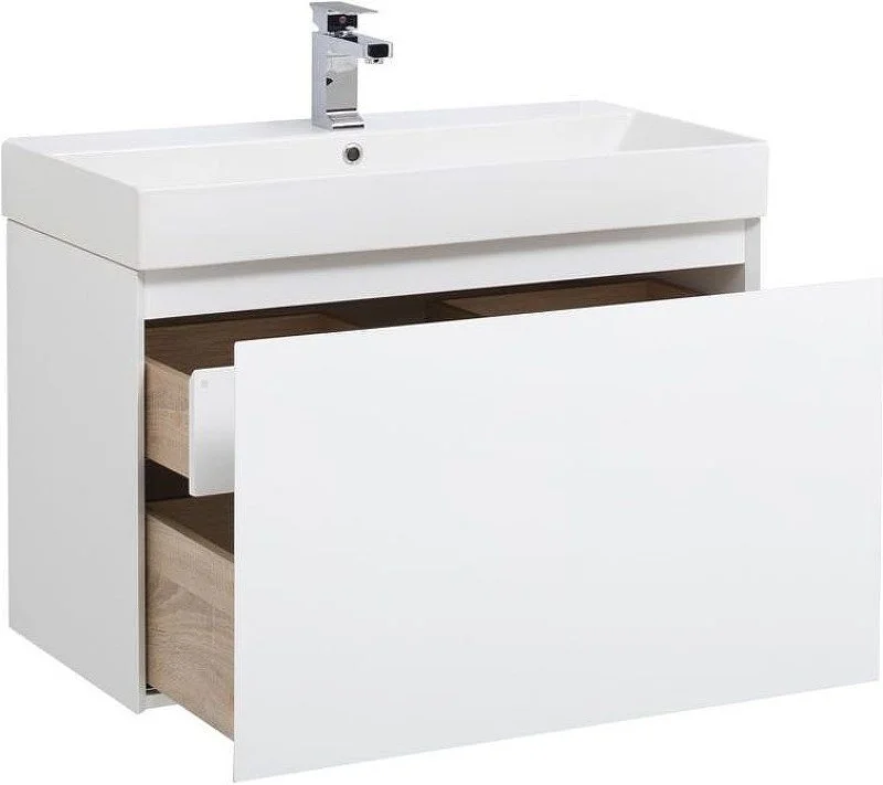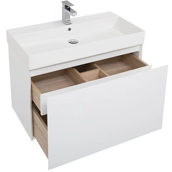 Тумба с раковиной Aquanet Йорк 85 кажется довольно-таки простой внешне, но за видимой простотой кроется тщательная работа над каждой линией, над каждой деталью. Обратите внимание на интегрированную ручку, которой по сути не видно, но при открывании выдвижного ящика она поражает удобством использования. Радует глаз зеркальная чистота глянцевой поверхности фасада из МДФ. Мебель белоснежная. Цветовой акцент появляется при выдвижении ящика тумбы, так как внутренние детали сделаны в цвете «дуб сонома». Сочетание выглядит благородно и эстетично, при этом не изменяя общей идее лаконичности во всем. Ящик в тумбочке один, но внутри него прячется еще одна зона хранения, в которой можно разложить по местам разнообразные мелочи. В системе выдвижения использована фурнитура немецкого производителя Hettich. Тумба шириной 85 см комплектуется керамической раковиной Sanovit. Она может быть как подвесной, так и напольной – на выбор покупателя. <