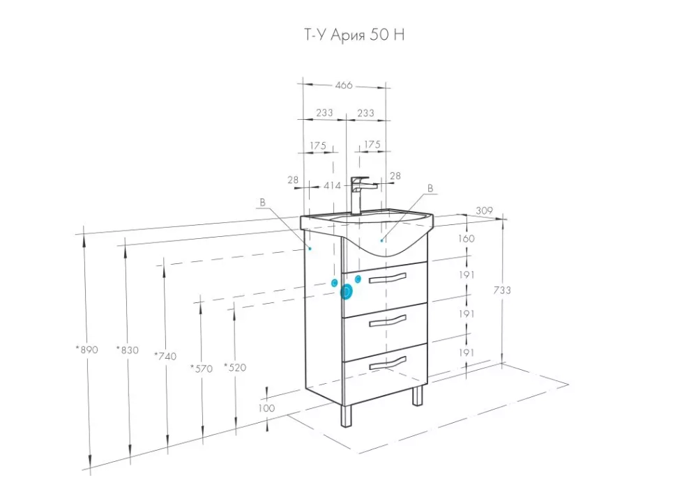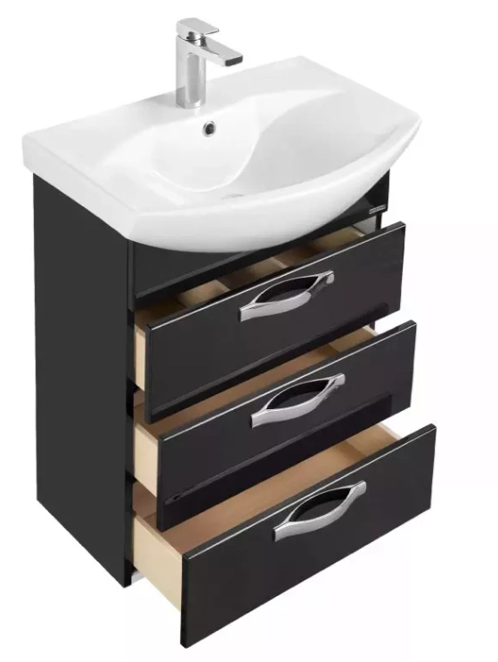 Комплектация: ручки – 3; ящики в декоративной отделке - 3; шариковые направляющие; навесы - 2; ножки - 2, раковина Смайл-50 (арт. 1WH207781).