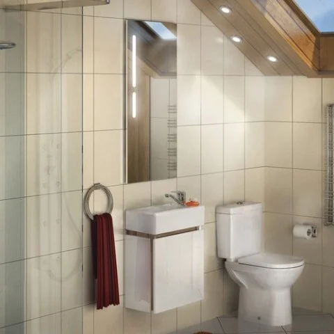 Подвесная тумба крепится в месте установки умывальника, скрывая неэстетичные монтажные элементы.