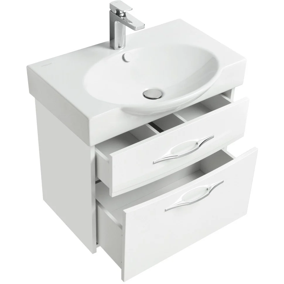 В подвесной тумбе два ящика снабжены системой плавного закрывания. Мебель украшают изящные ручки бельгийского производителя METAKOR.