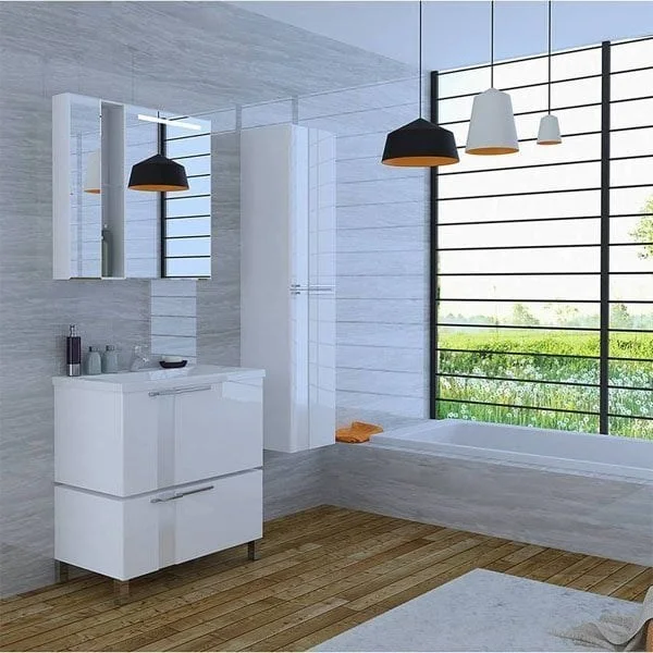 Тумба укомплектована раковиной из литого мрамора Тина 1000. Асимметричный дизайн лицевой фурнитуры подчеркивают стеклянные вставки, установленные на фасадах. В тумбе один двухстенный ящик, снабженный интегрированными доводчиками, обеспечивающими плавное закрывание.