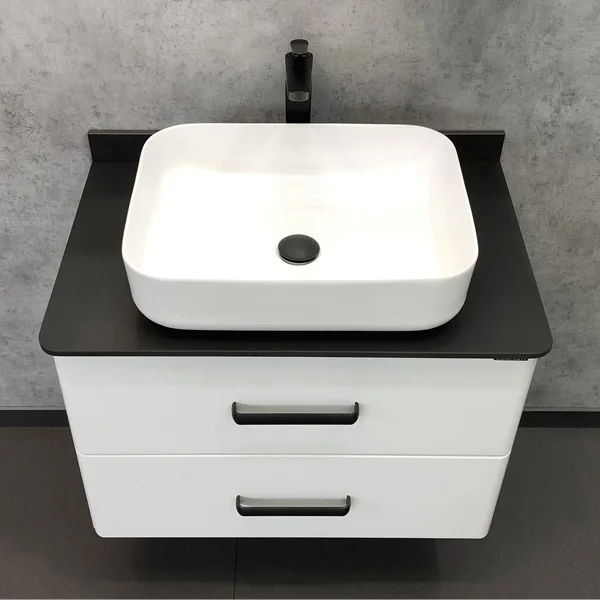 Подвесная тумба-умывальник в современном стиле с двумя выкатными ящиками. Ящики оснащены системой с плавным закрыванием. Верхний ящик разбит на два сегмента. Тумба укомплектована столешницей и плинтусом из черного матового керамогранита и накладной прямоугольной раковиной.