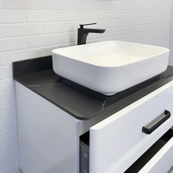Подвесная тумба-умывальник в современном стиле с двумя выкатными ящиками. Ящики оснащены системой с плавным закрыванием. Верхний ящик разбит на два сегмента. Тумба укомплектована столешницей и бортиком из матового керамогранита под мрамор Калакатта Блэк и накладной прямоугольной раковиной.