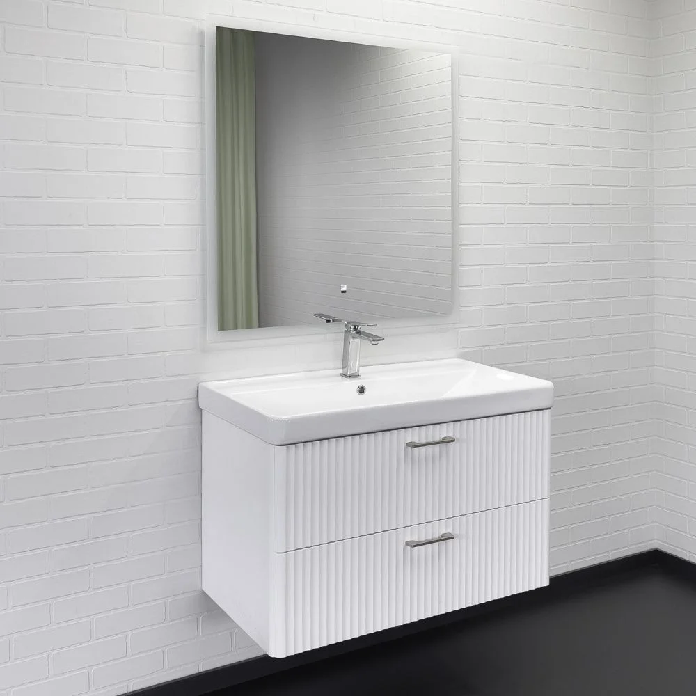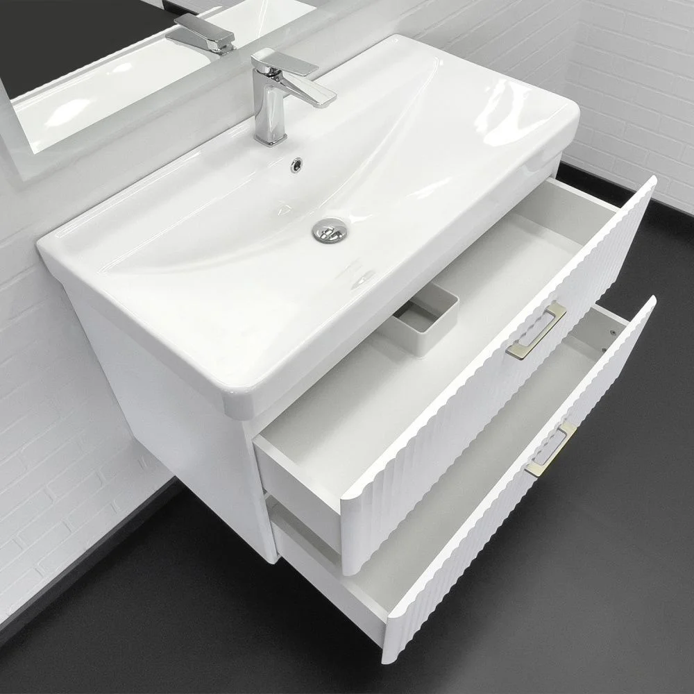 Подвесная тумба с двумя выдвижными ящиками оборудованными системой плавного закрывания. Фасад и боковые стенки корпуса изготовлены из МДФ и окрашены белой матовой эмалью. Фрезеровка фасадов выполнена в дорической форме. Внутренние детали тумбы выполнены из влагостойкого ЛДСП. Металлические ручки скобы под естественный хват цвета жемчужный никель. Тумба подготовлена для подключения водоснабжения сзади и снизу.