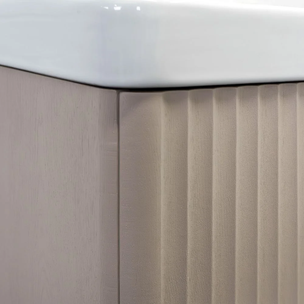 Подвесная тумба с двумя выдвижными ящиками оборудованными системой плавного закрывания. Фасад и боковые стенки корпуса изготовлены из МДФ и покрыты декоративной пленкой с тиснением под дерево - дуб латте. Фрезеровка фасадов выполнена в дорической форме. Внутренние детали тумбы выполнены из влагостойкого ЛДСП. Металлические ручки скобы под естественный хват цвета жемчужный никель. Тумба подготовлена для подключения водоснабжения сзади и снизу.