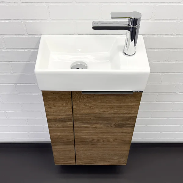Компактная подвесная тумба-умывальник Comforty Асти для небольших санузлов. Фасад и корпус тумбы изготовлены из влагостойкого ДСП. В комплекте асимметричная раковина с отверстием под смеситель сбоку. Раковина покрыта глазурью со всех сторон, поэтому может быть установлена как в правом, так и в левом варианте.