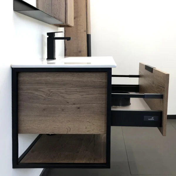Подвесная тумба-умывальник из влагостойкого ЛДСП дуб темный с одним выкатным ящиком оснащенным системой плавного закрывания и нижней полкой открытого хранения.