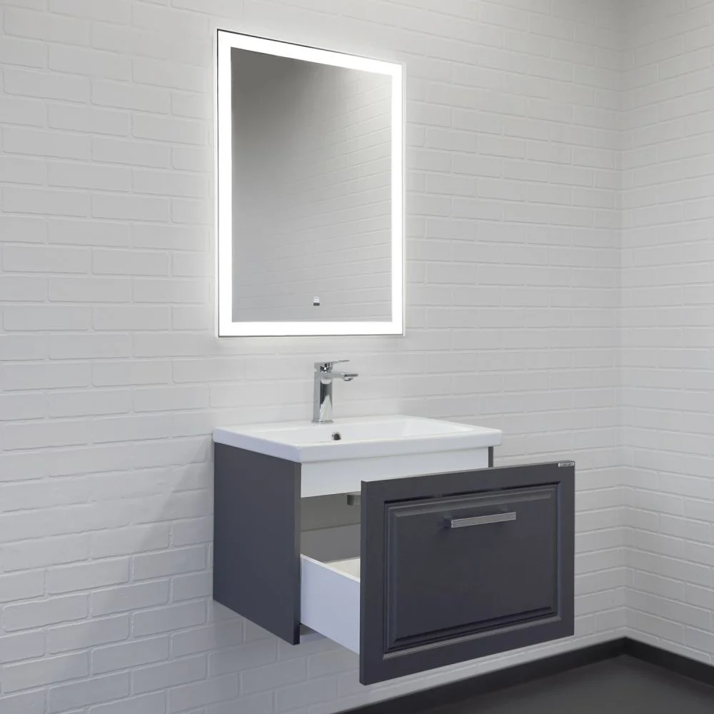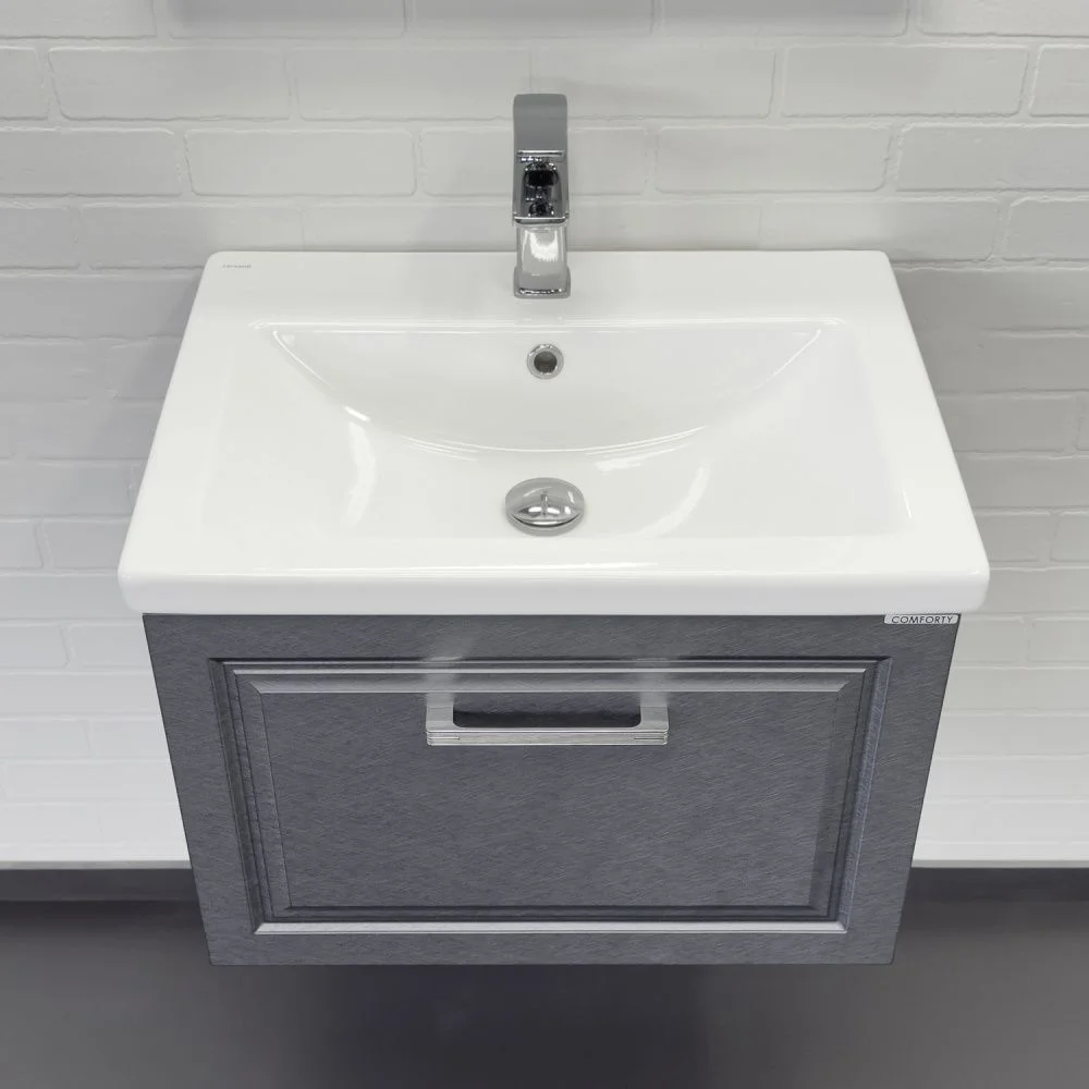 Подвесная тумба-умывальник шириной 60 см с одним выдвижным ящиком. Фасад ящика декорированы фрезеровкой по контуру. Ящик оснащен направляющими с механизмом плавного закрывания. В модели применяется матовая пленка цвета оружейная сталь с эффектом браширования. Тумба подготовлена для подключения коммуникаций сзади и снизу.