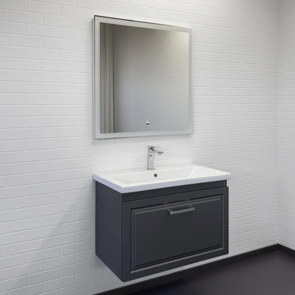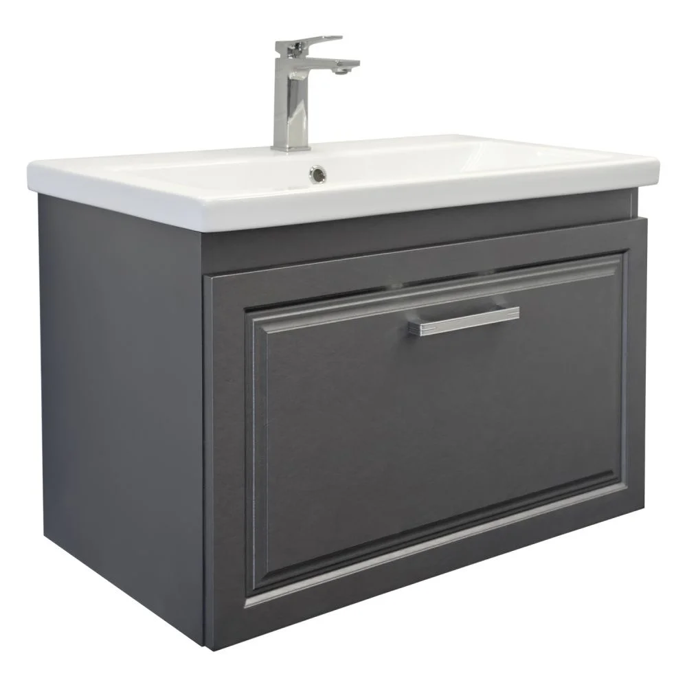 Подвесная тумба-умывальник шириной 80 см с одним выдвижным ящиком. Фасад ящика декорированы фрезеровкой по контуру. Ящик оснащен направляющими с механизмом плавного закрывания. В модели применяется матовая пленка цвета оружейная сталь с эффектом браширования. Тумба подготовлена для подключения коммуникаций сзади и снизу.