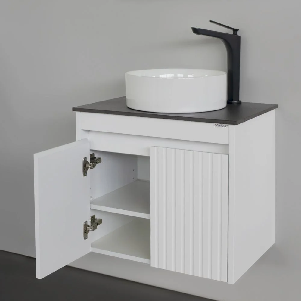 Комплектация: накладная керамическая раковина Comforty 9111, черная матовая столешница из керамогранита под мрамор Калакатта Блэк.