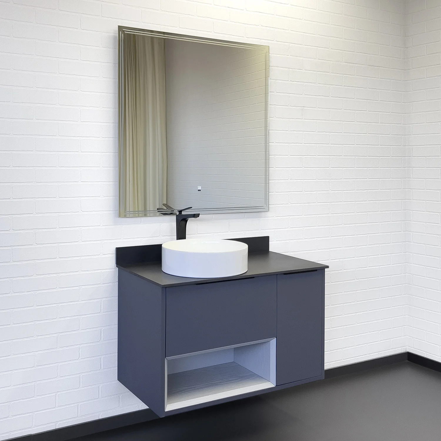 Подвесная тумба с одним ящиком и створкой оборудованными системой плавного закрывания. Предусмотрено пространство для открытого хранения. На фасадах тумбы черные матовые алюминиевые ручки. Прямоугольная раковина-чаша установлена на столешницу из керамогранита. В комплекте также пристенный плинтус. Ниша открытого хранения сделана из МДФ в пленке серого цвета с текстурой дерева. Торцы вставки спилены под углом.