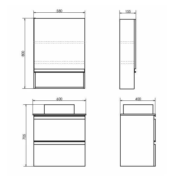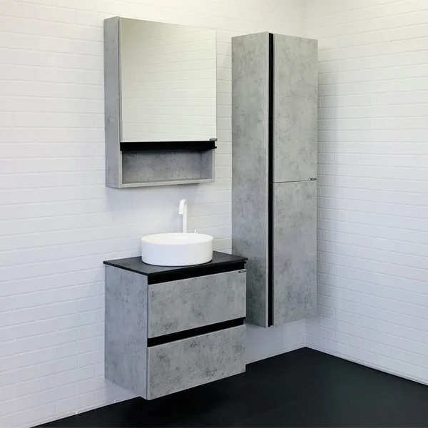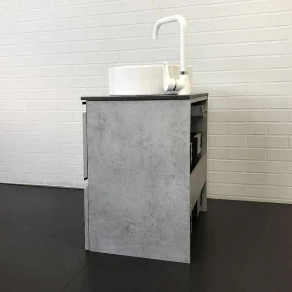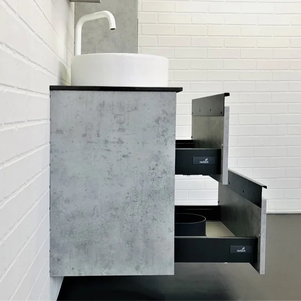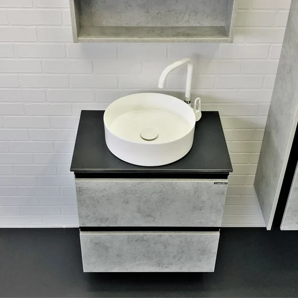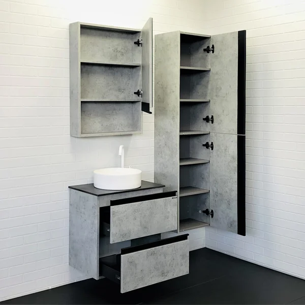 Тумба-умывальник в современном стиле с глубокими выкатными ящиками. Ящики оснащены системой плавного закрывания. Тумба укомплектована черными матовыми профильными ручками, столешницей из черного керамогранита и накладной круглой раковиной из санфарфора.