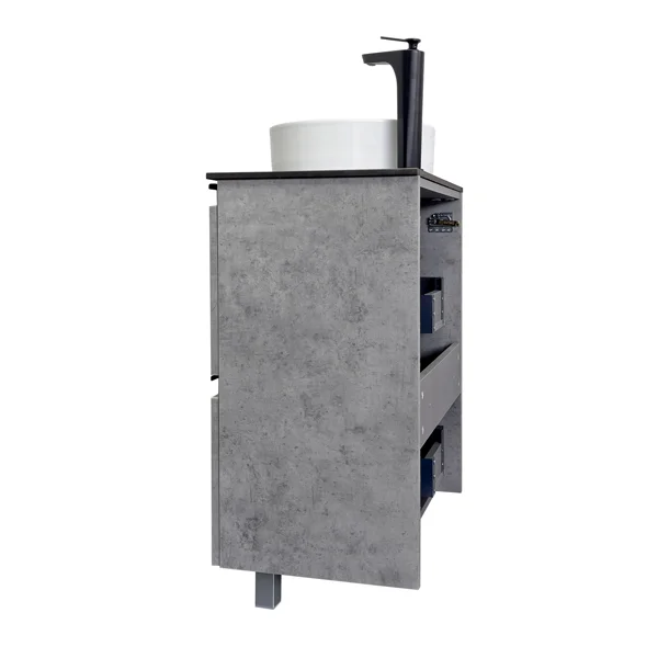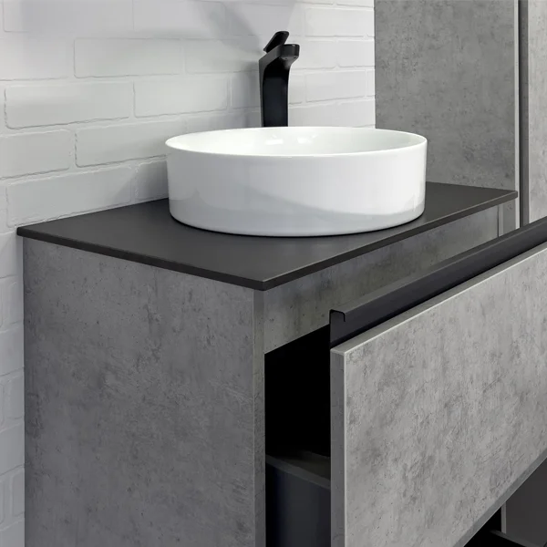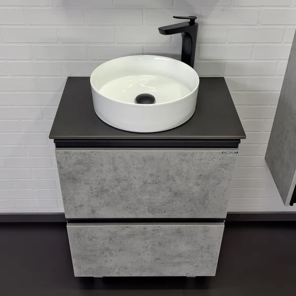Полуподвесная тумба-умывальник в современном стиле с двумя выкатными ящиками. Ящики оснащены системой плавного закрывания. Тумба укомплектована черными матовыми профильными ручками, столешницей из черного керамогранита и накладной круглой раковиной из санфарфора.