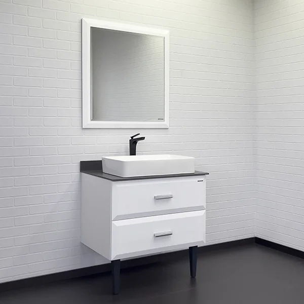 Напольно-подвесная тумба-умывальник с двумя выдвижными ящиками оснащенными системой плавного закрывания. Оригинальные эргономичные металлические ручки. Фасады окрашены белой глянцевой эмалью. Две декоративные ножки из массива натурального дерева.