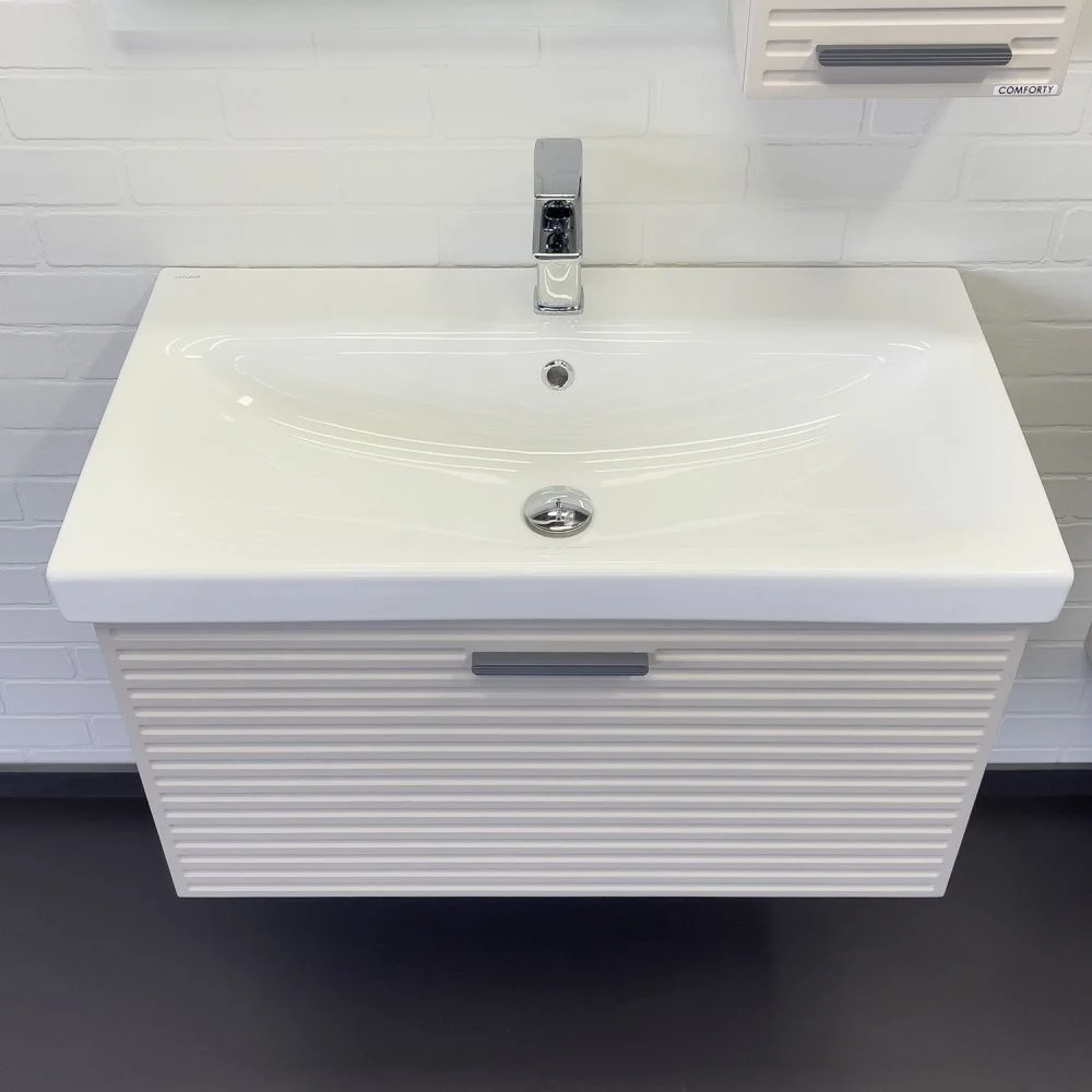Подвесная тумба с одним большим выкатным ящиком c направляющими оборудованными системой плавного закрывания. Корпус тумбы изготовлены из влагостойкого ЛДСП. Фасад тумбы из МДФ фрезерован горизонтальным узором и обтянут в пленку цвета "серый шелк". Тумба подготовлена для подключения водоснабжения снизу и сзади.