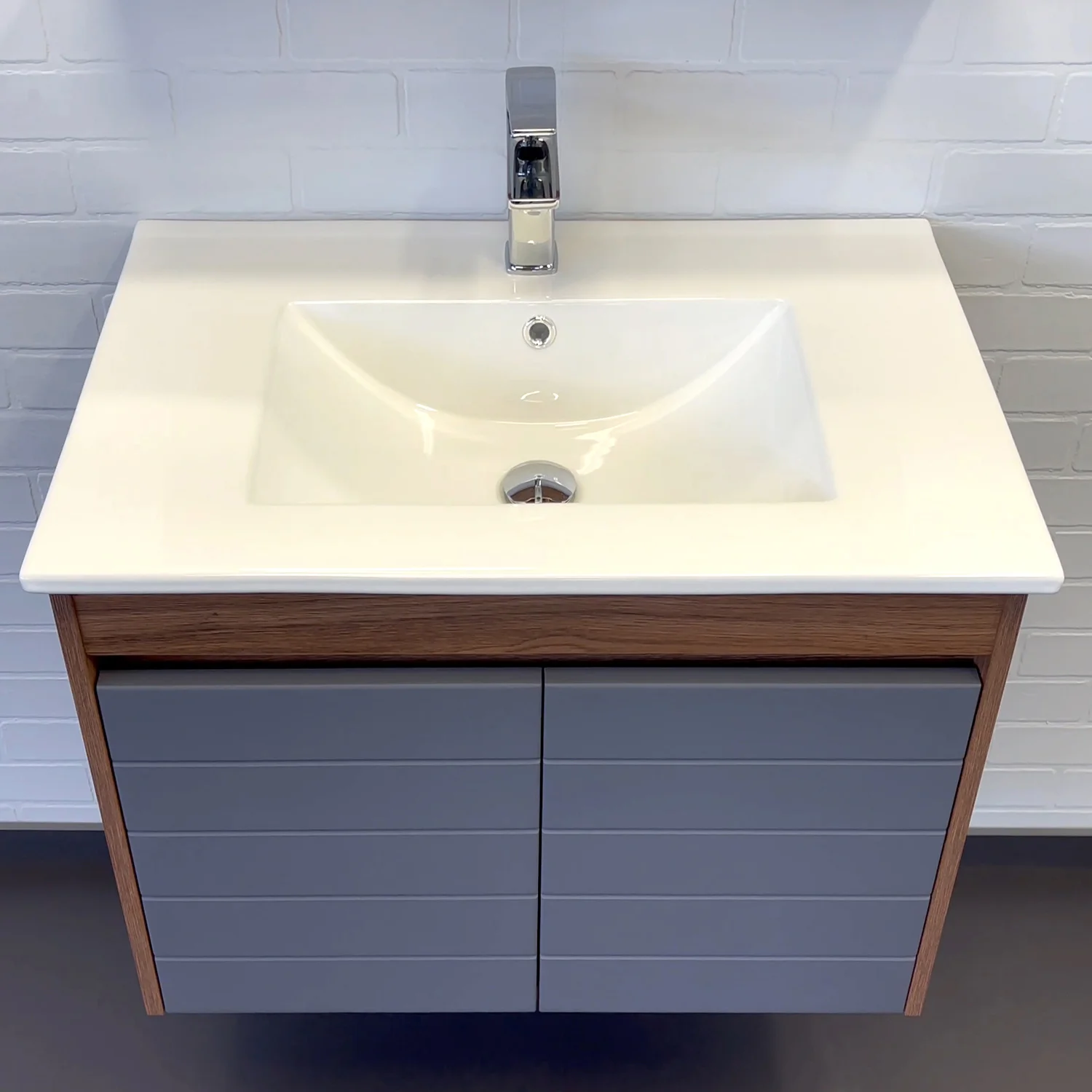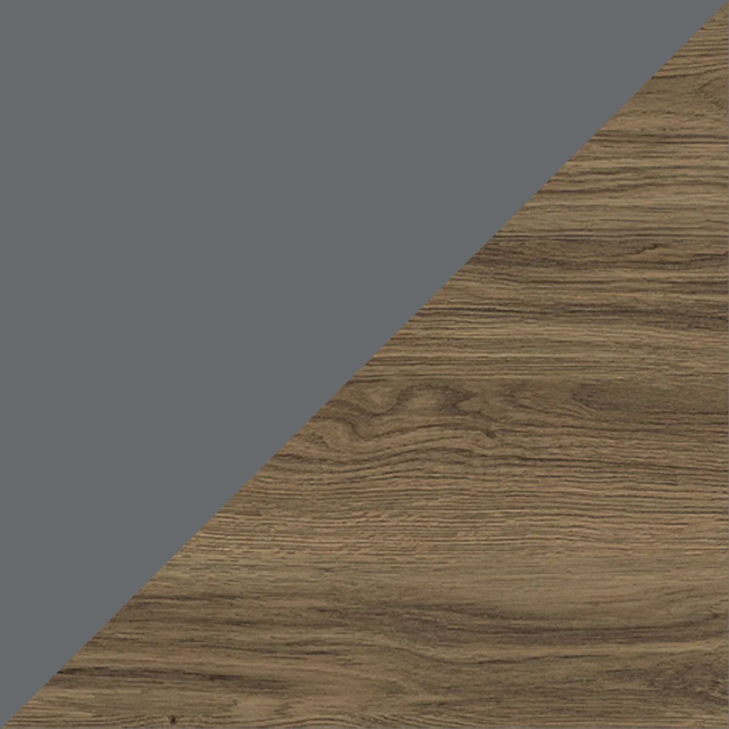 Подвесная тумба-умывальник с двумя распашными створками, оснащенными петлями с системой плавного закрывания. Фасад тумбы из МДФ украшен горизонтальным узором и обтянут в пленку цвета антрацит.