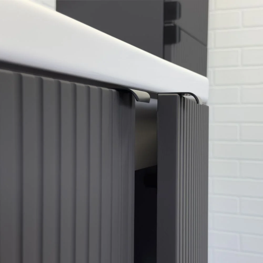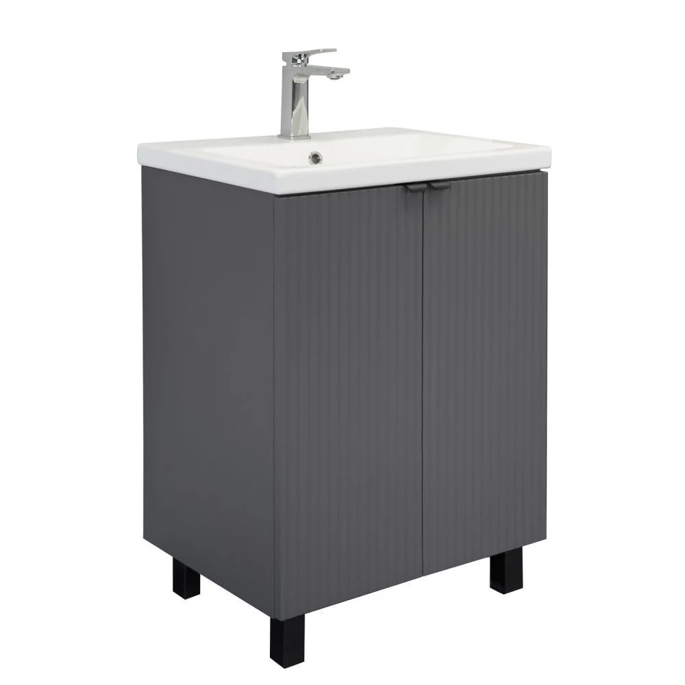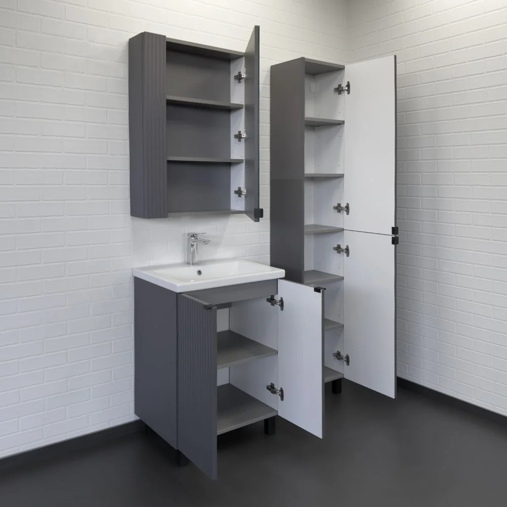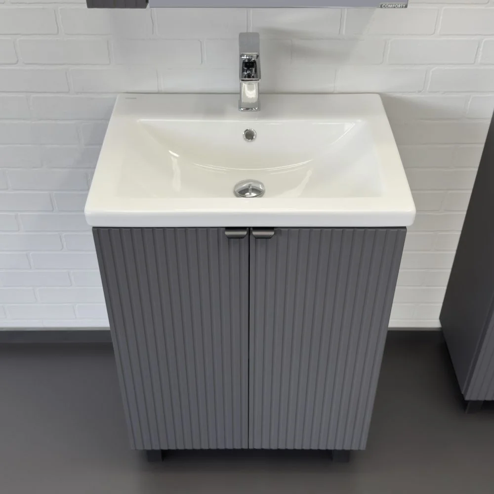 Напольная тумба-умывальник с двумя распашными створками декорированными вертикальной фрезеровкой. Створки оснащены петлями плавного закрывания. За створками одна полка. В модели применяется пленка цвета антрацит с эффектом Soft-Touch. Тумба подготовлена для подключения коммуникаций снизу и сзади.