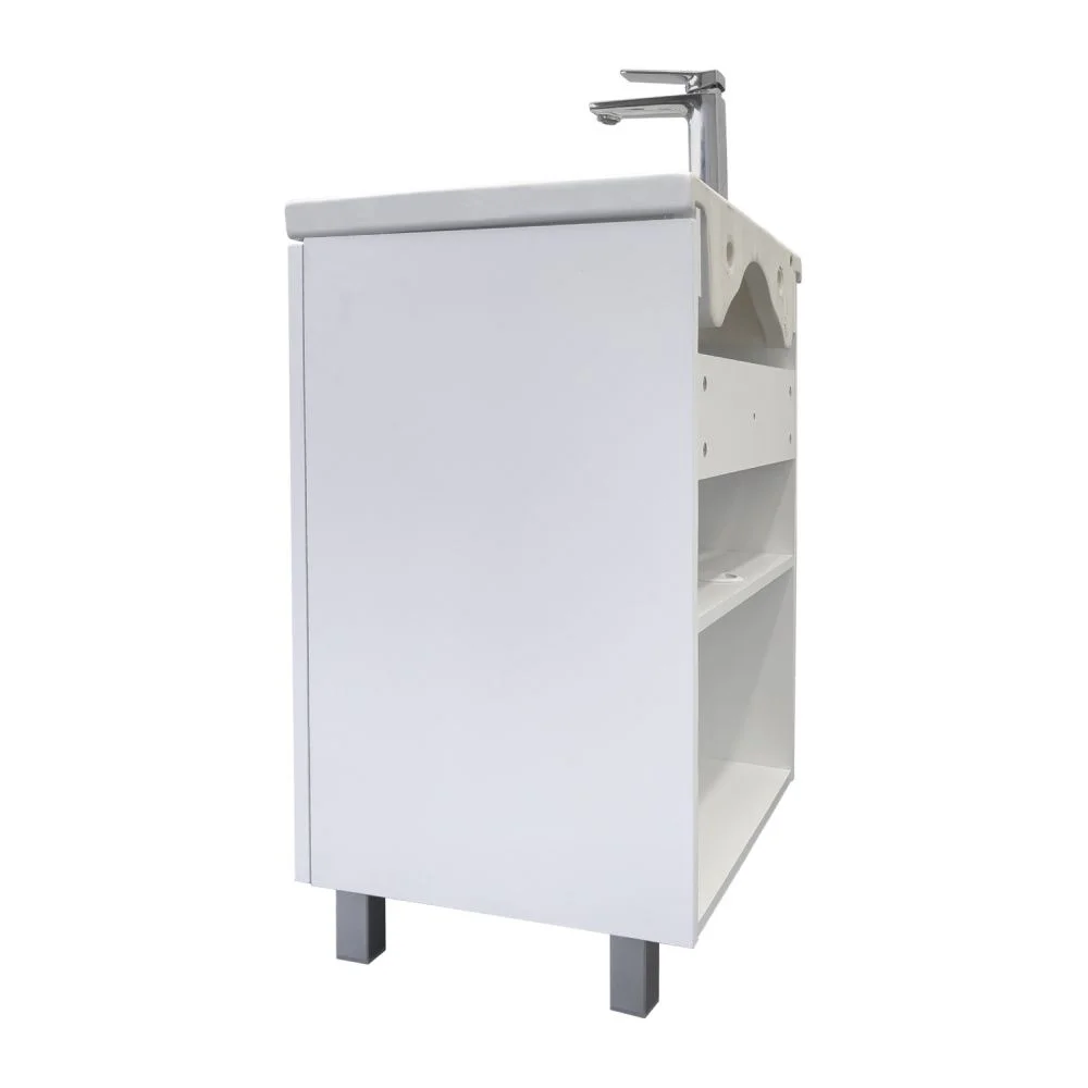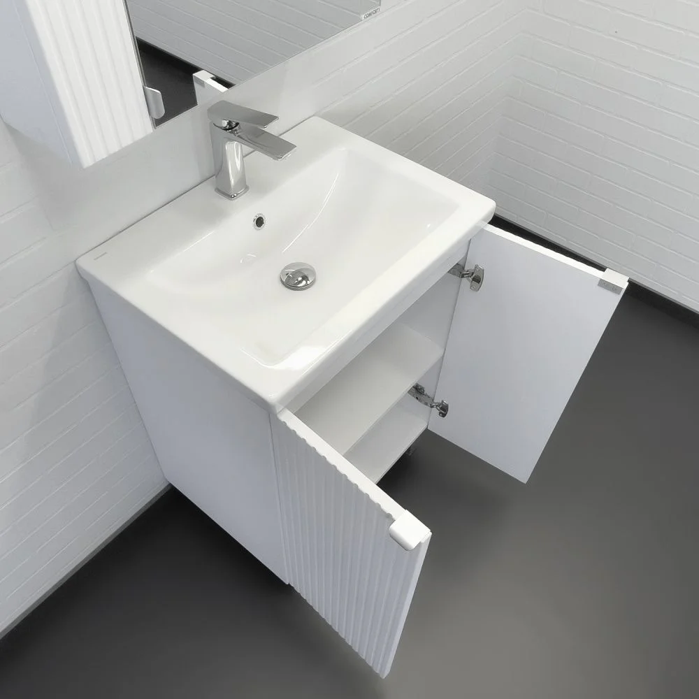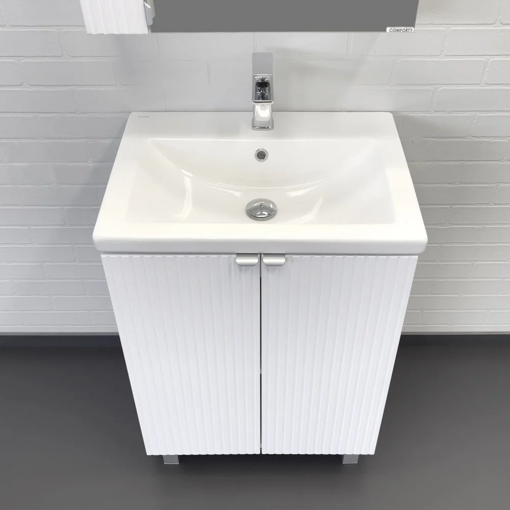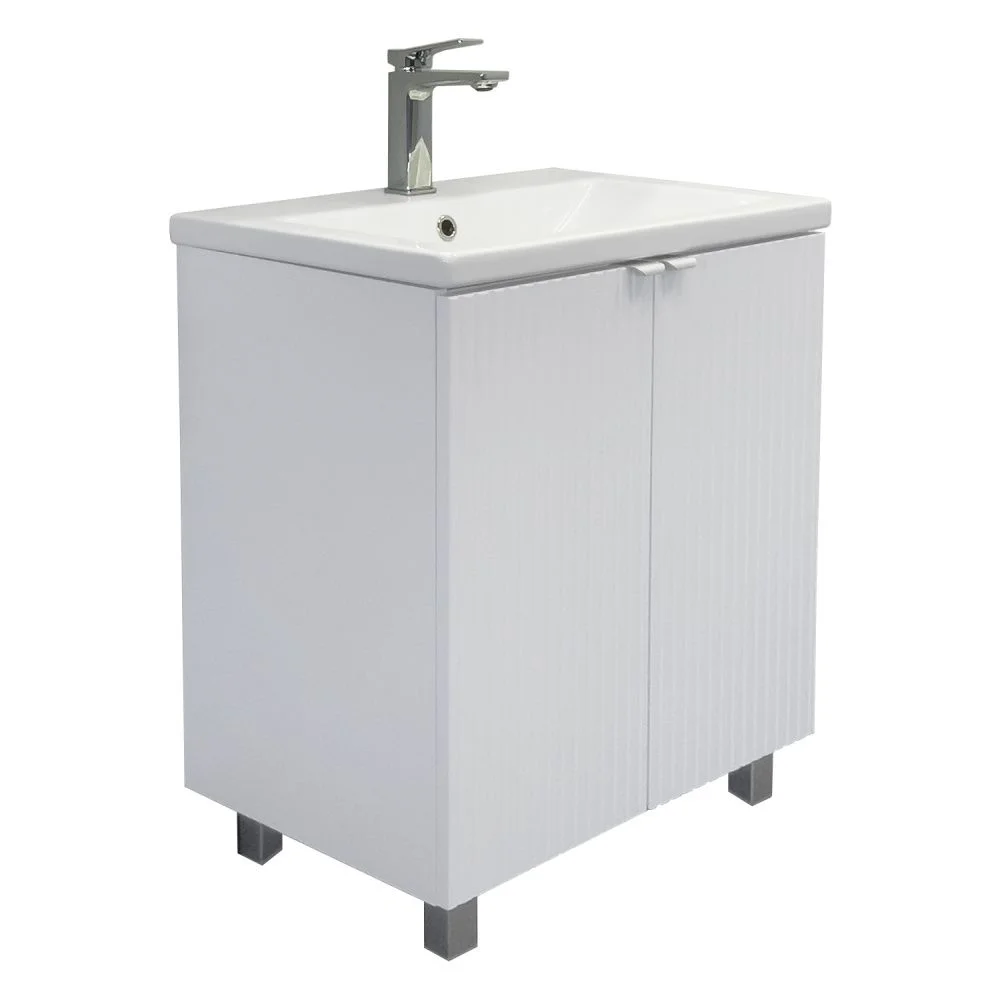 Напольная тумба-умывальник с двумя распашными створками декорированными вертикальной фрезеровкой. Створки оснащены петлями плавного закрывания. За створками одна полка. В модели применяется пленка белого цвета с эффектом Soft-Touch. Тумба подготовлена для подключения коммуникаций снизу и сзади.