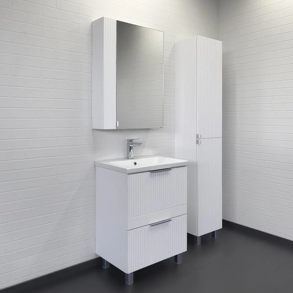 Напольная тумба-умывальник с двумя выдвижными ящиками декорированными вертикальной фрезеровкой. Ящики оснащены направляющими с механизмами плавного закрывания. В модели применяется пленка белого цвета с эффектом Soft-Touch. Тумба подготовлена для подключения коммуникаций снизу и сзади.