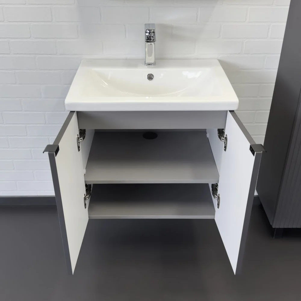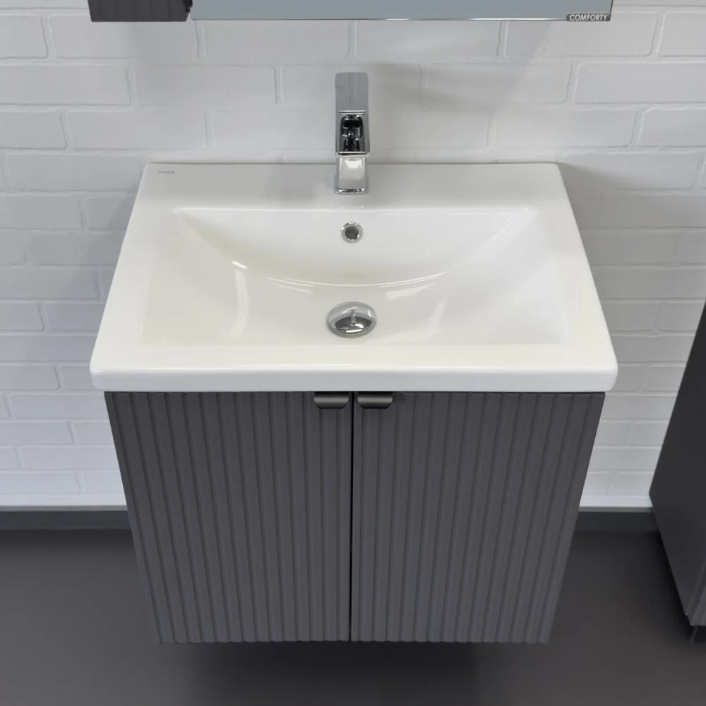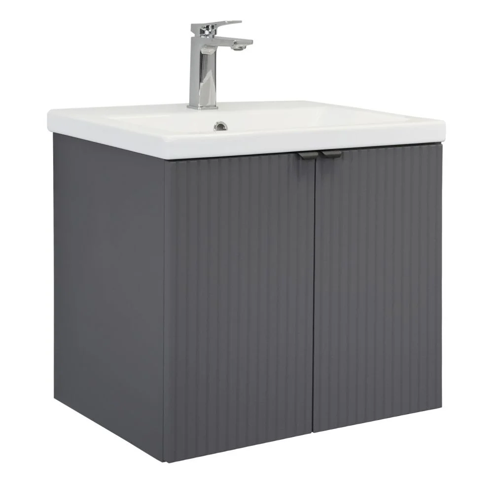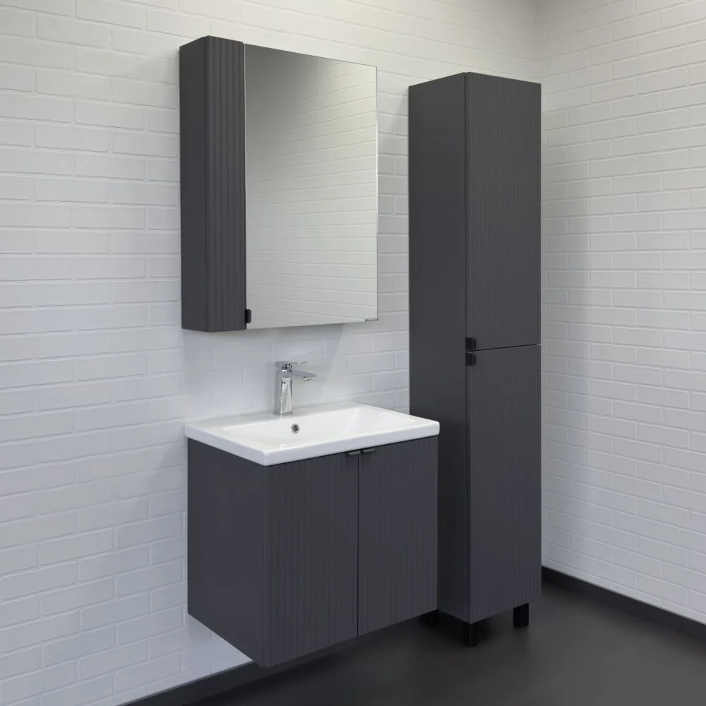 Подвесная тумба-умывальник шириной 60 см с двумя распашными створками декорированными вертикальной фрезеровкой. Створки оснащены петлями плавного закрывания. За створками одна полка. В модели применяется матовая пленка цвета антрацит с эффектом Soft-Touch.