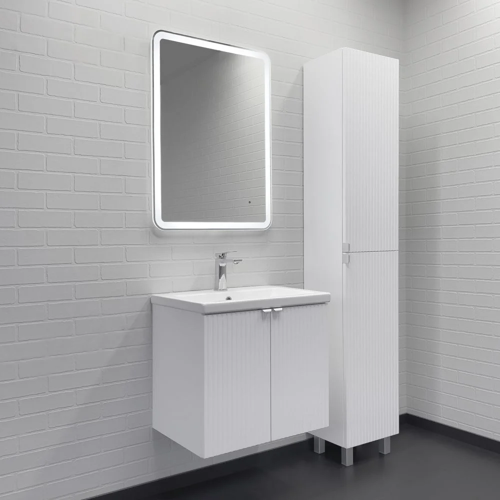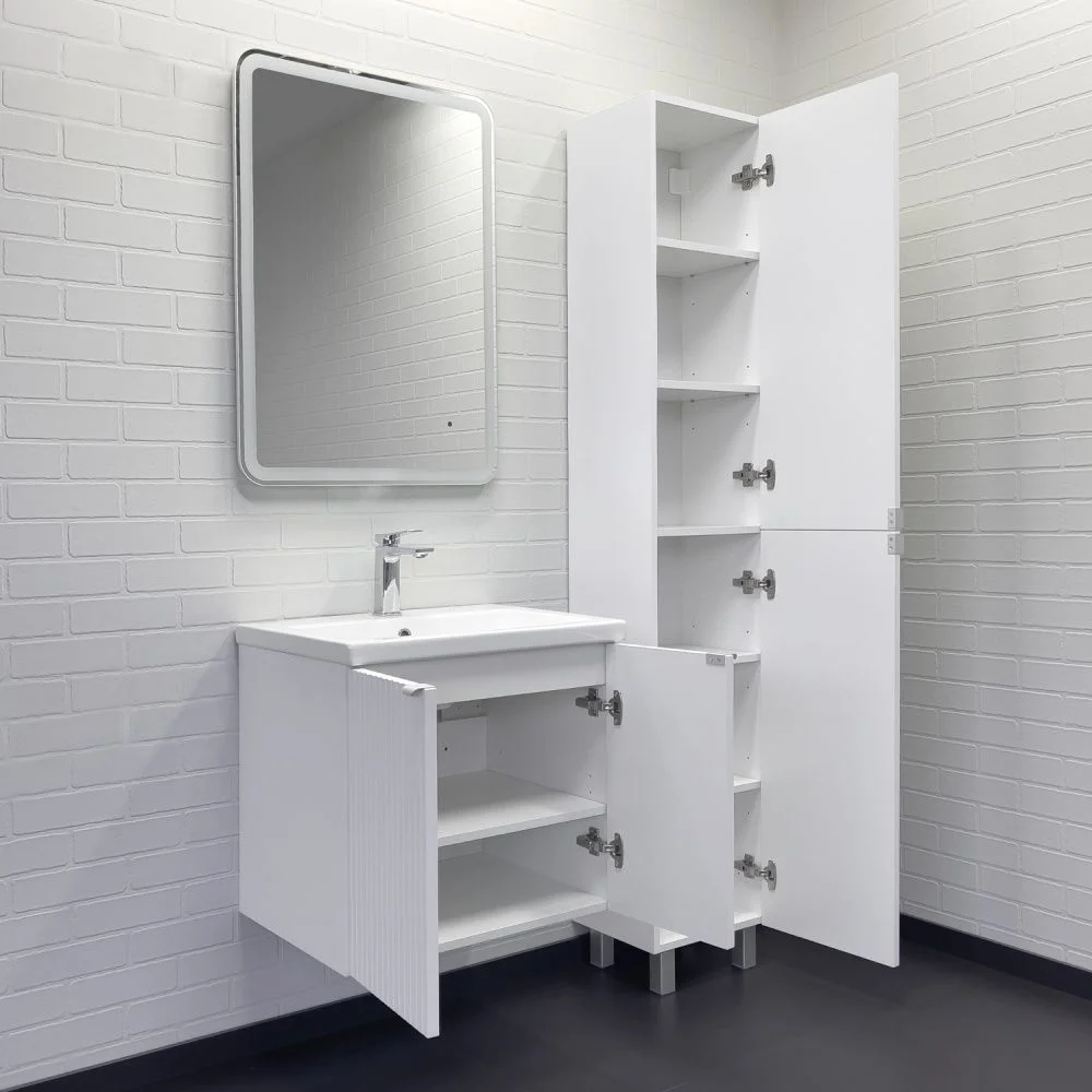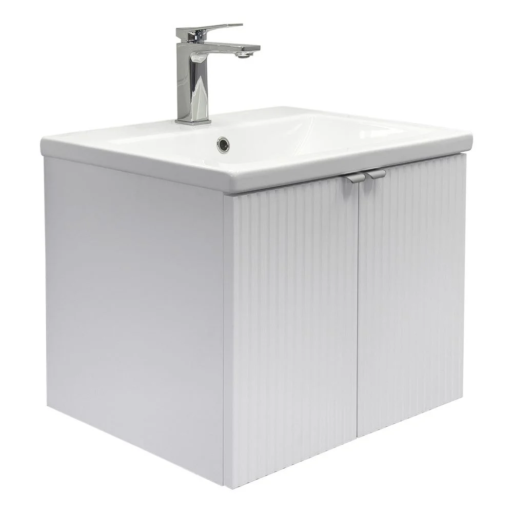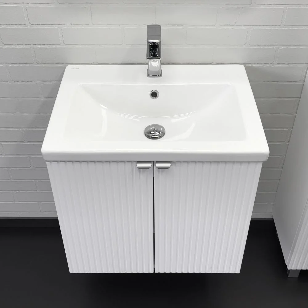 Подвесная тумба-умывальник шириной 60 см с двумя распашными створками декорированными вертикальной фрезеровкой. Створки оснащены петлями плавного закрывания. За створками одна полка. В модели применяется матовая пленка белого цвета с эффектом Soft-Touch.