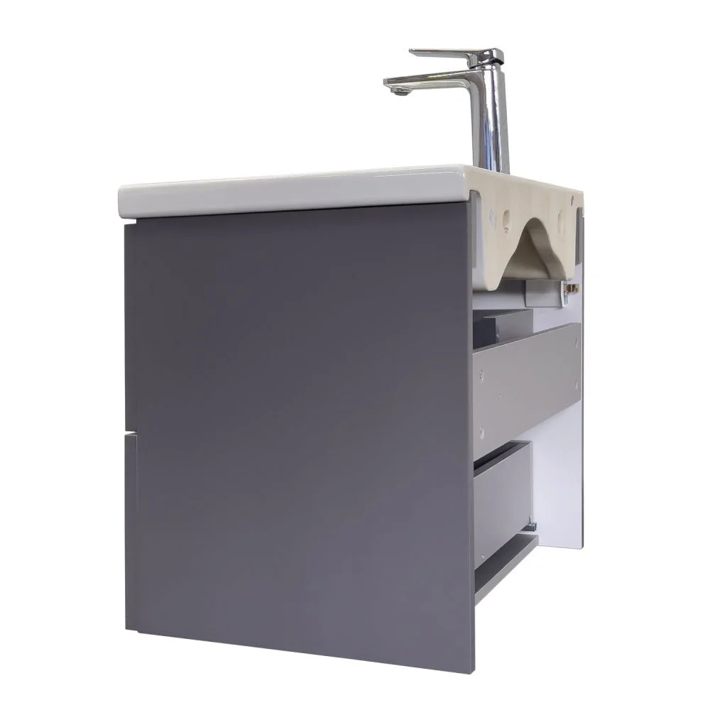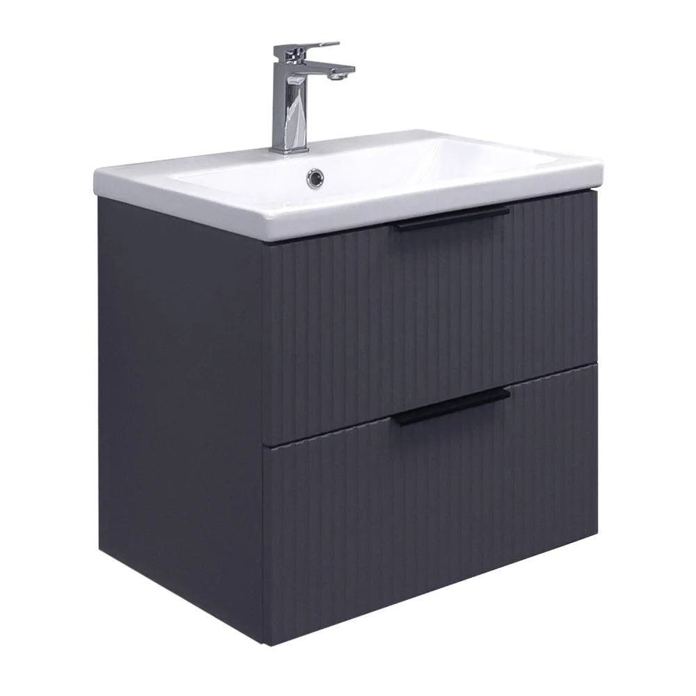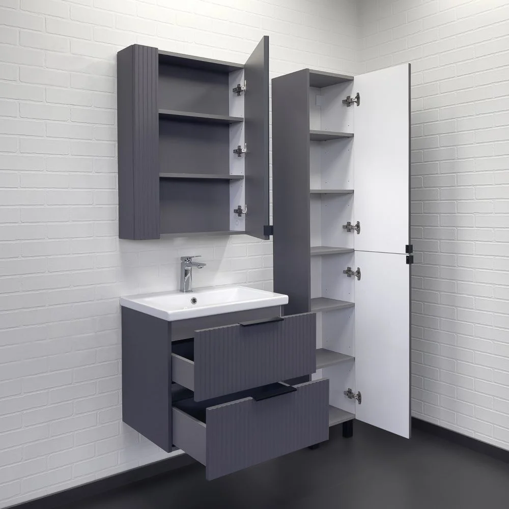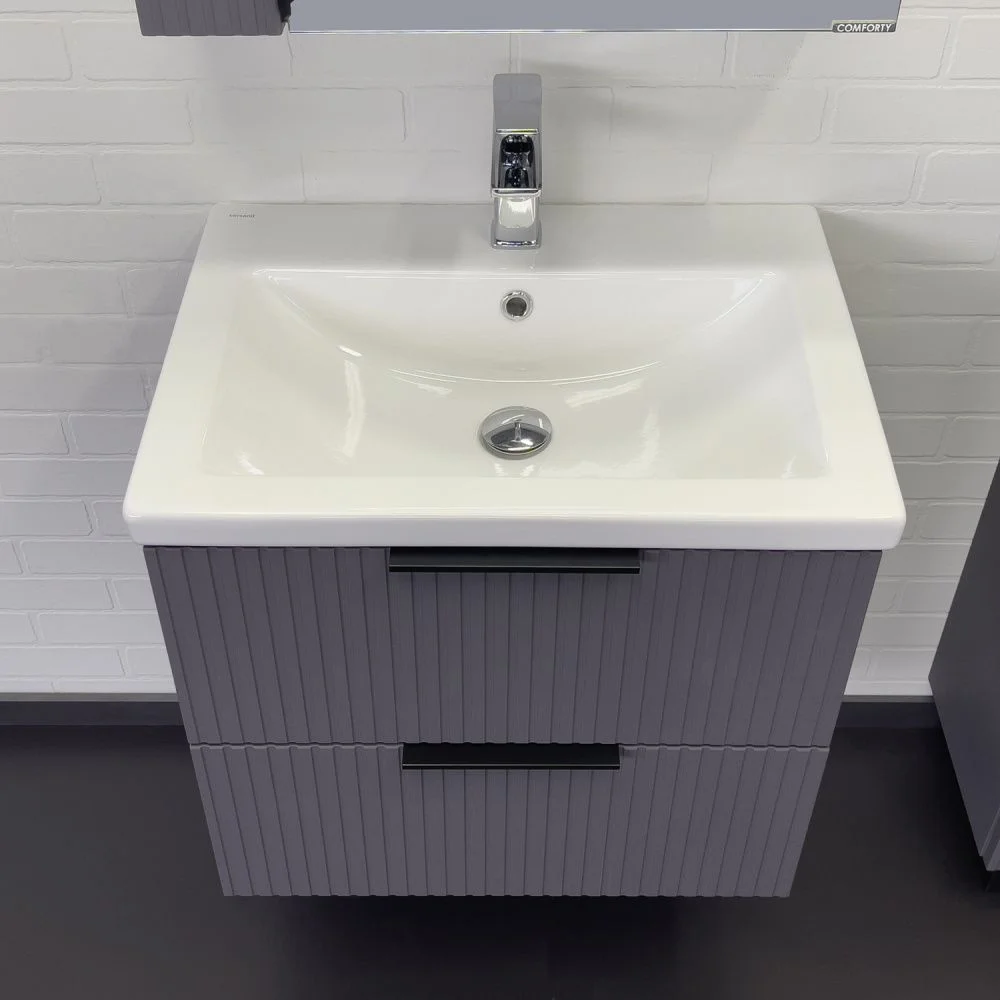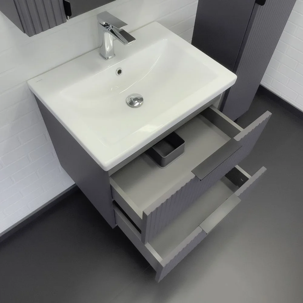 Подвесная тумба-умывальник шириной 60 см с двумя выдвижными ящиками. Фасады ящиков декорированы вертикальной фрезеровкой. Ящики оснащены направляющими с механизмами плавного закрывания. В модели применяется матовая пленка цвета антрацит с эффектом Soft-Touch.