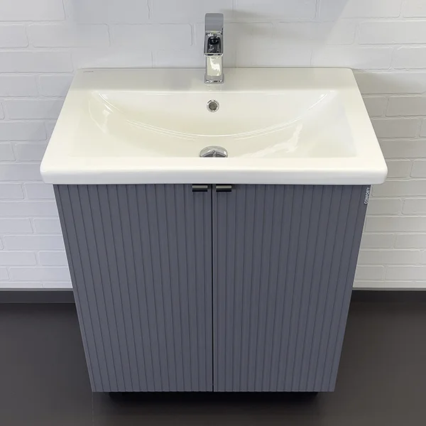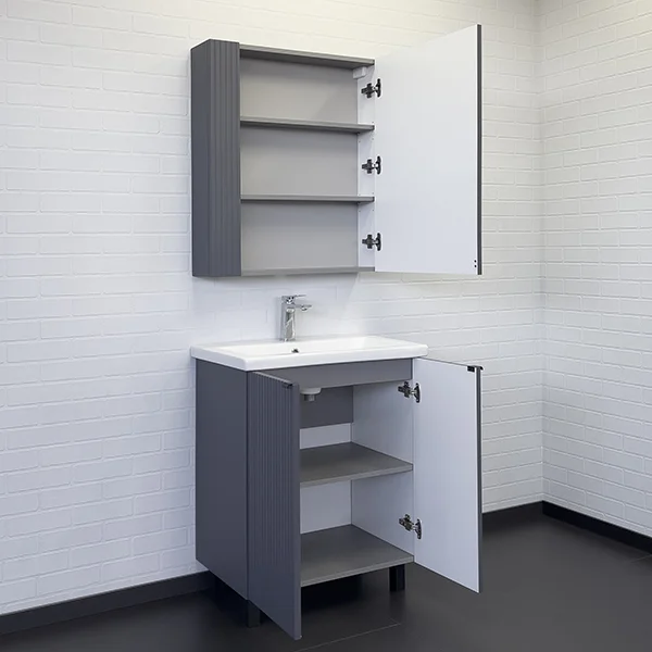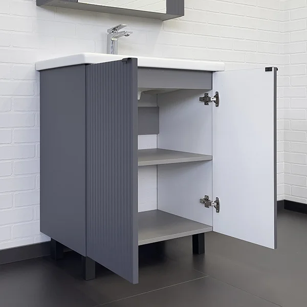 Напольная тумба-умывальник с двумя распашными створками декорированными вертикальной фрезеровкой. Створки оснащены петлями плавного закрывания. За створками одна полка. В модели применяется пленка с эффектом Soft-Touch.