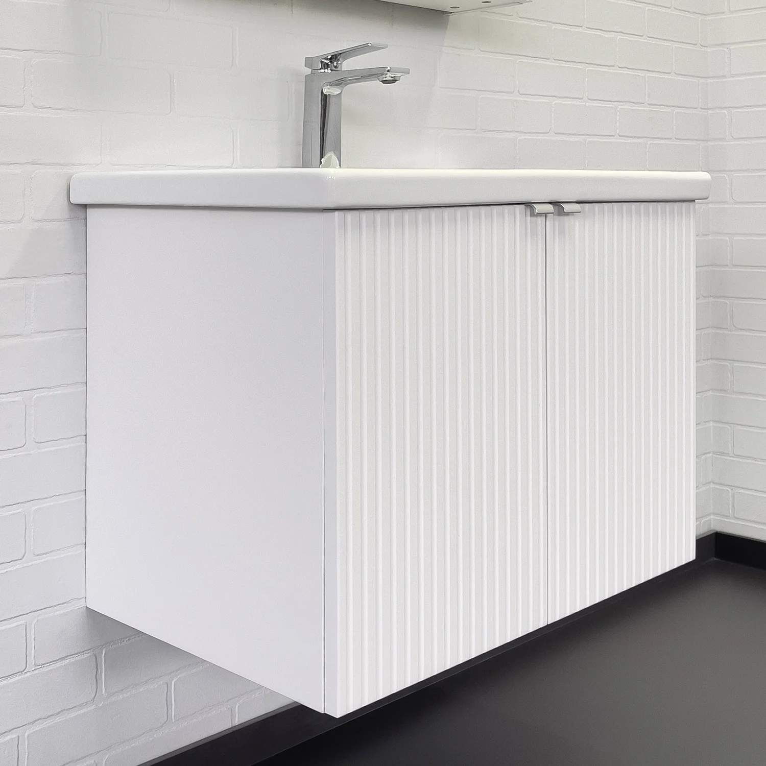 Подвесная тумба-умывальник с двумя распашными створками декорированными вертикальной фрезеровкой. Створки оснащены петлями плавного закрывания. За створками одна полка. В модели применяется матовая пленка белого цвета с эффектом Soft-Touch.