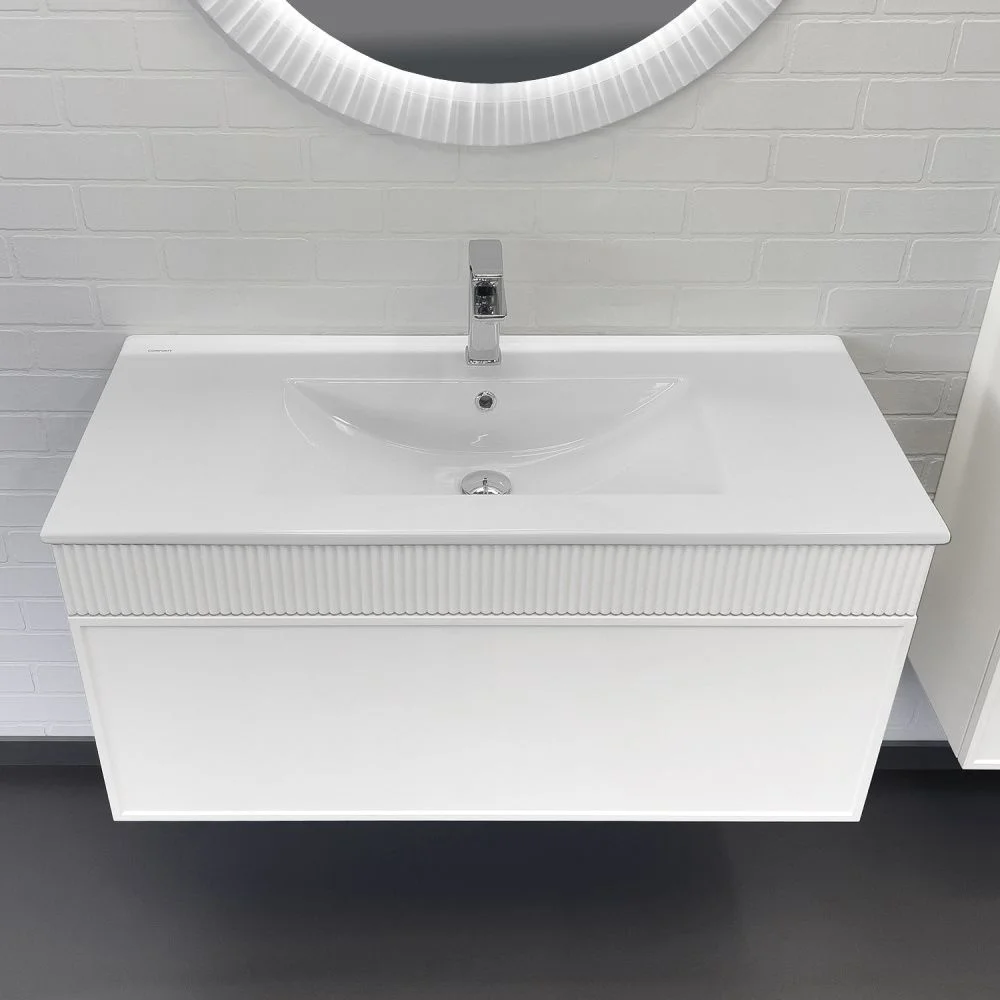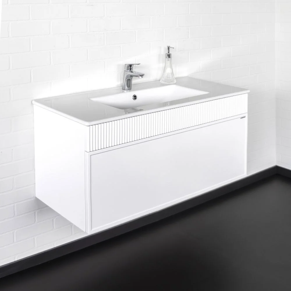 Подвесная тумба с одним большим выкатным ящиком оборудованным направляющими с системой плавного закрывания. Корпус тумбы изготовлены из влагостойкого ЛДСП. Фасад тумбы из МДФ фрезерован кантом по периметру. Подпорная царга фрезерована вертикальным узором. Корпус и фасад тумбы окрашены белой матовой эмалью. Тумба подготовлена для подключения водоснабжения снизу и сзади.