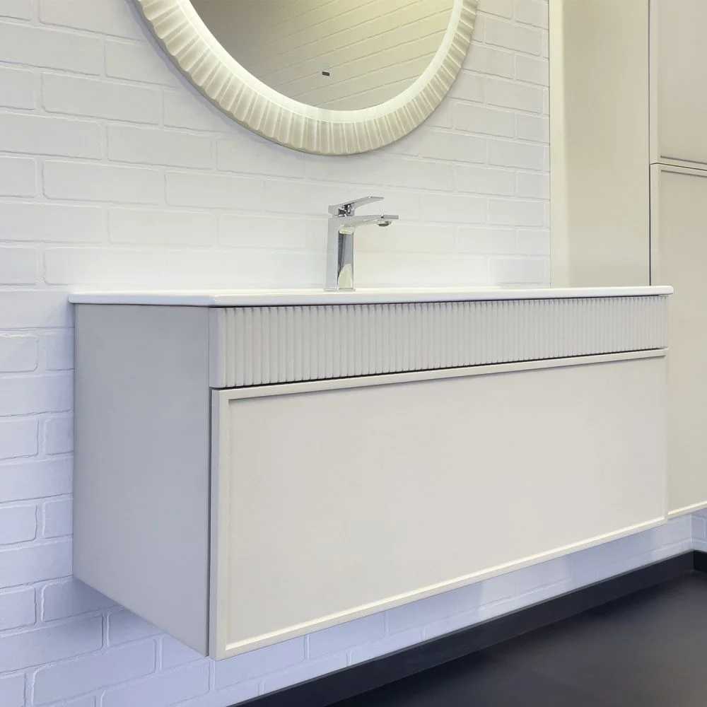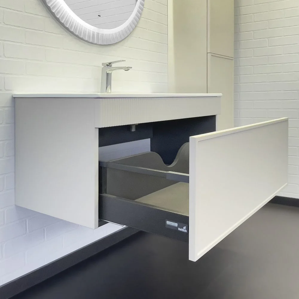 Подвесная тумба с одним большим выкатным ящиком оборудованным направляющими с системой плавного закрывания. Корпус тумбы изготовлены из влагостойкого ЛДСП. Фасад тумбы из МДФ фрезерован кантом по периметру. Подпорная царга фрезерована вертикальным узором. Корпус и фасад тумбы затянуты в матовую пленку цвета "серый шелк". Тумба подготовлена для подключения водоснабжения снизу и сзади.